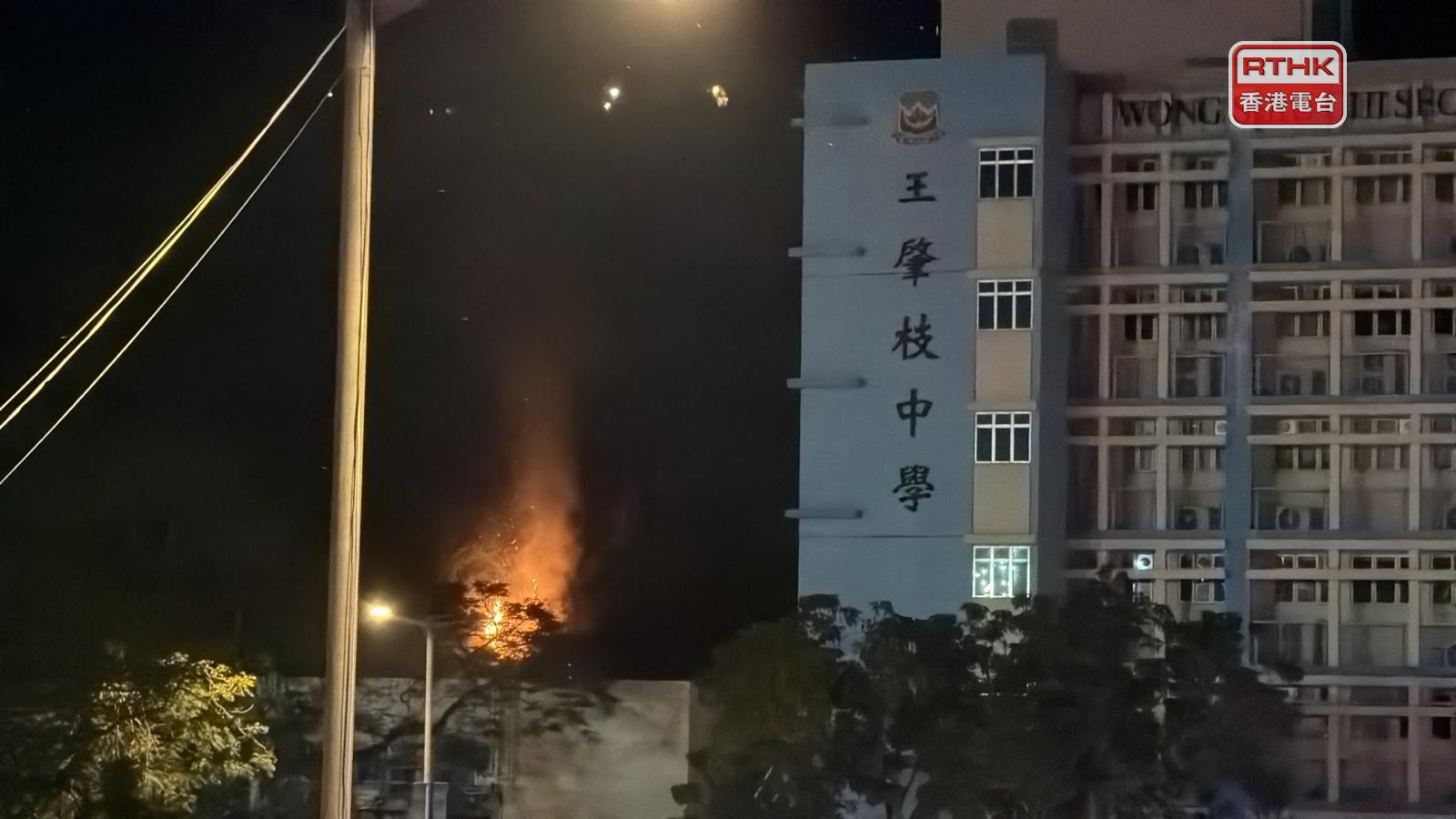 大埔宏福苑的五級火仍然未救熄,區內位於廣福道的王肇枝中學後山亦起火,消防處表示,晚上約10時接報,列作一級火處理,有救護車在場戒備。