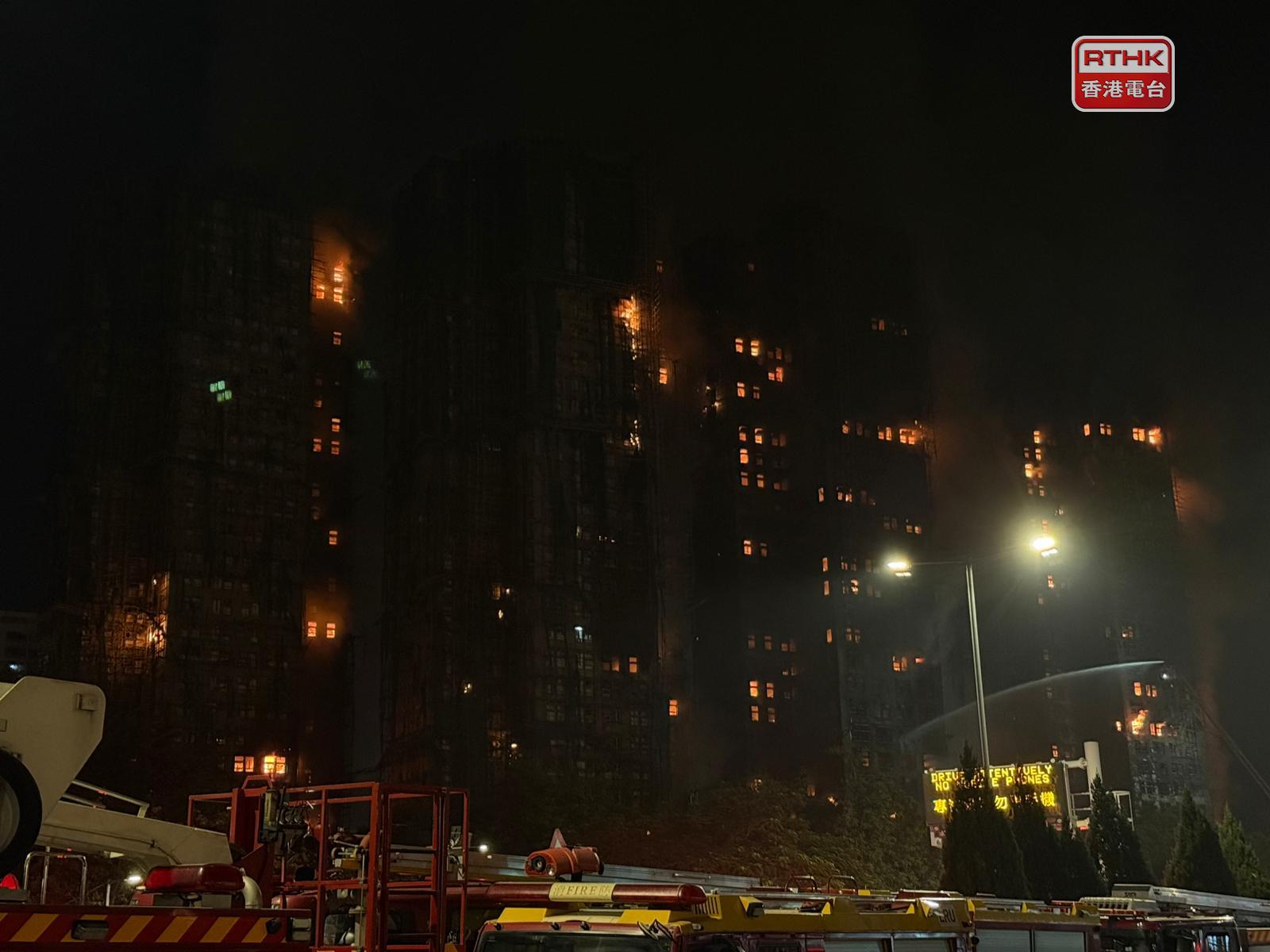 大埔宏福苑五級火由昨日下午2時許焚燒至今仍未救熄,多個單位仍然火光熊熊,火警至今造成至少13死30傷,消防繼續在大廈外射水灌救。凌晨有居民繼續聚集在附近廣福邨平台暫避,有食肆開放予居民入內留宿。