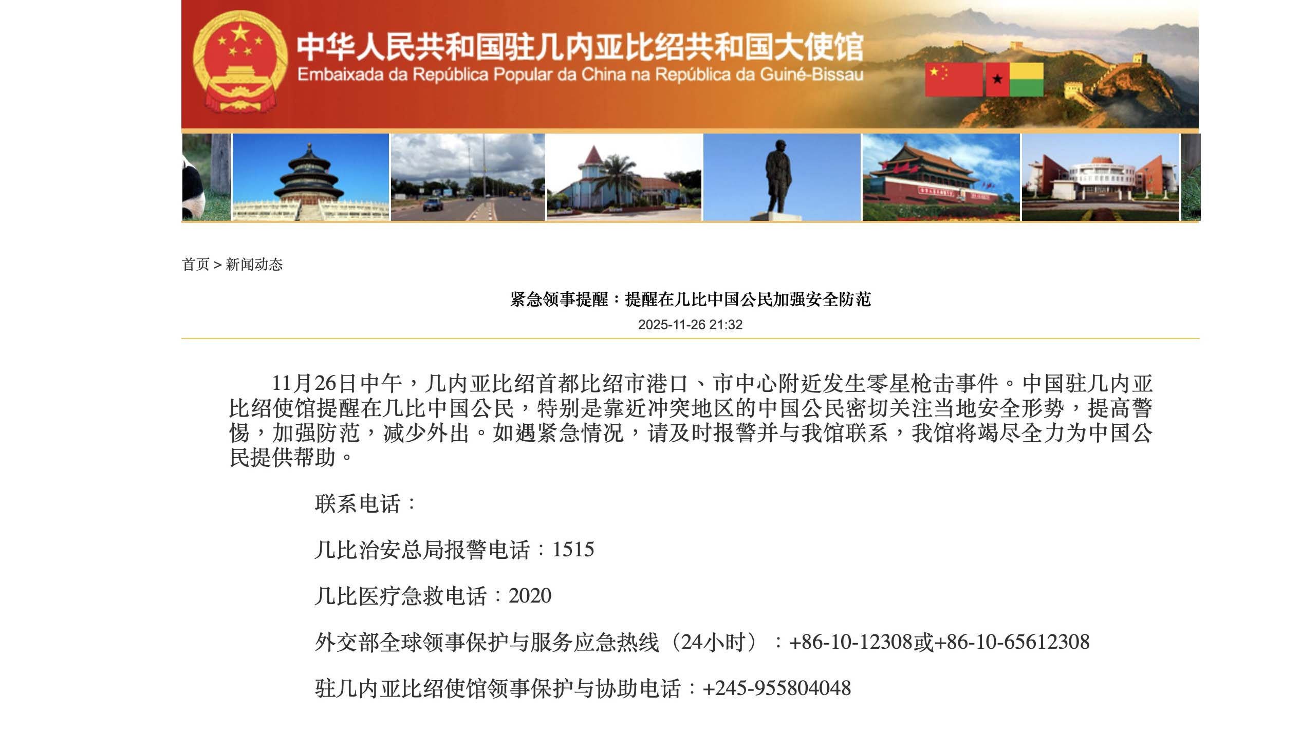 中國駐幾內亞比紹大使館發布緊急領事提醒,提醒在該國的中國公民加強安全防範,提高警惕,加強防範,減少外出。