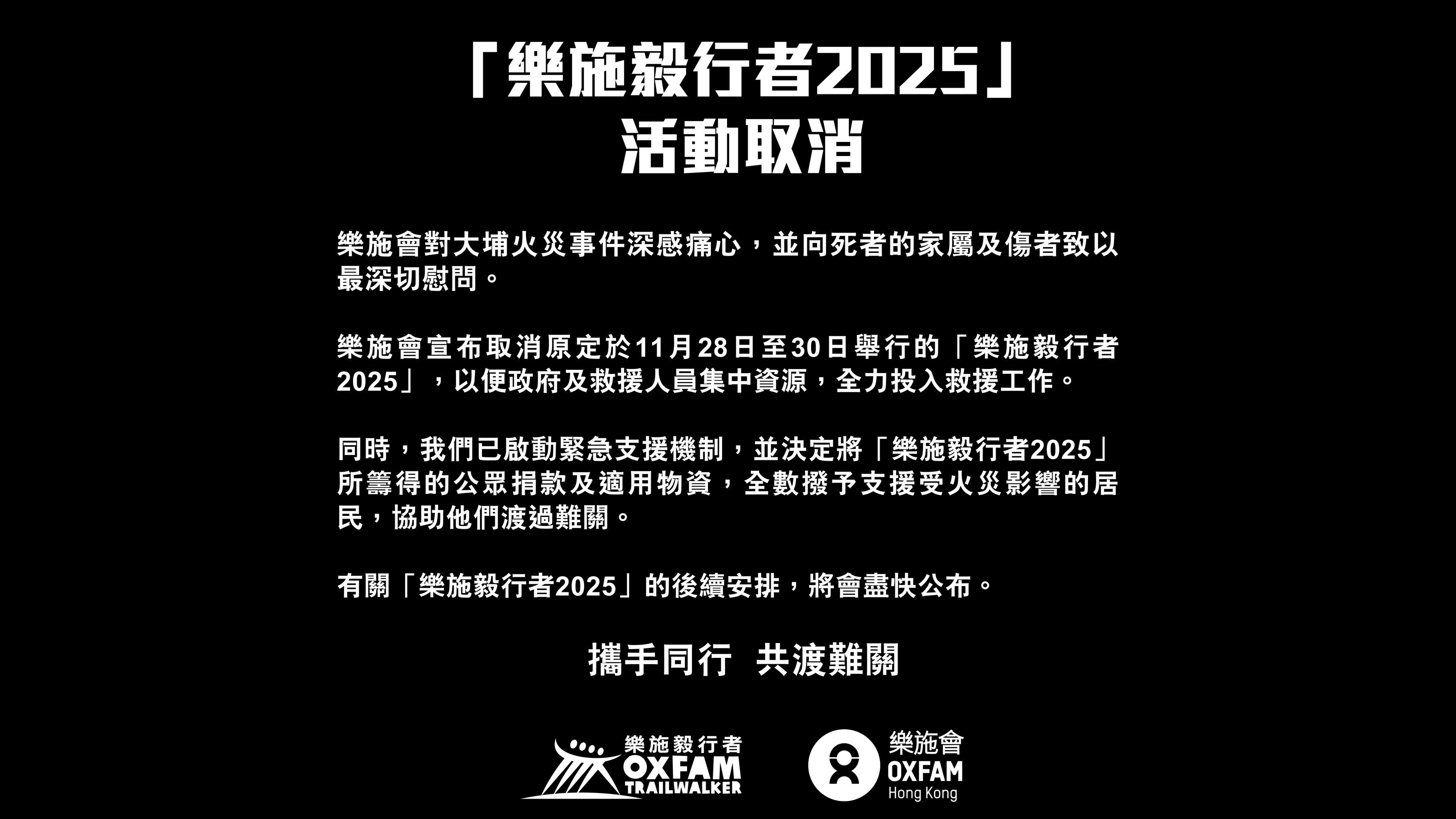 至於「樂施毅行者2025」取消後的後續安排,將會盡快公布。會方向參加者、義工、合作夥伴及支持者深表歉意。