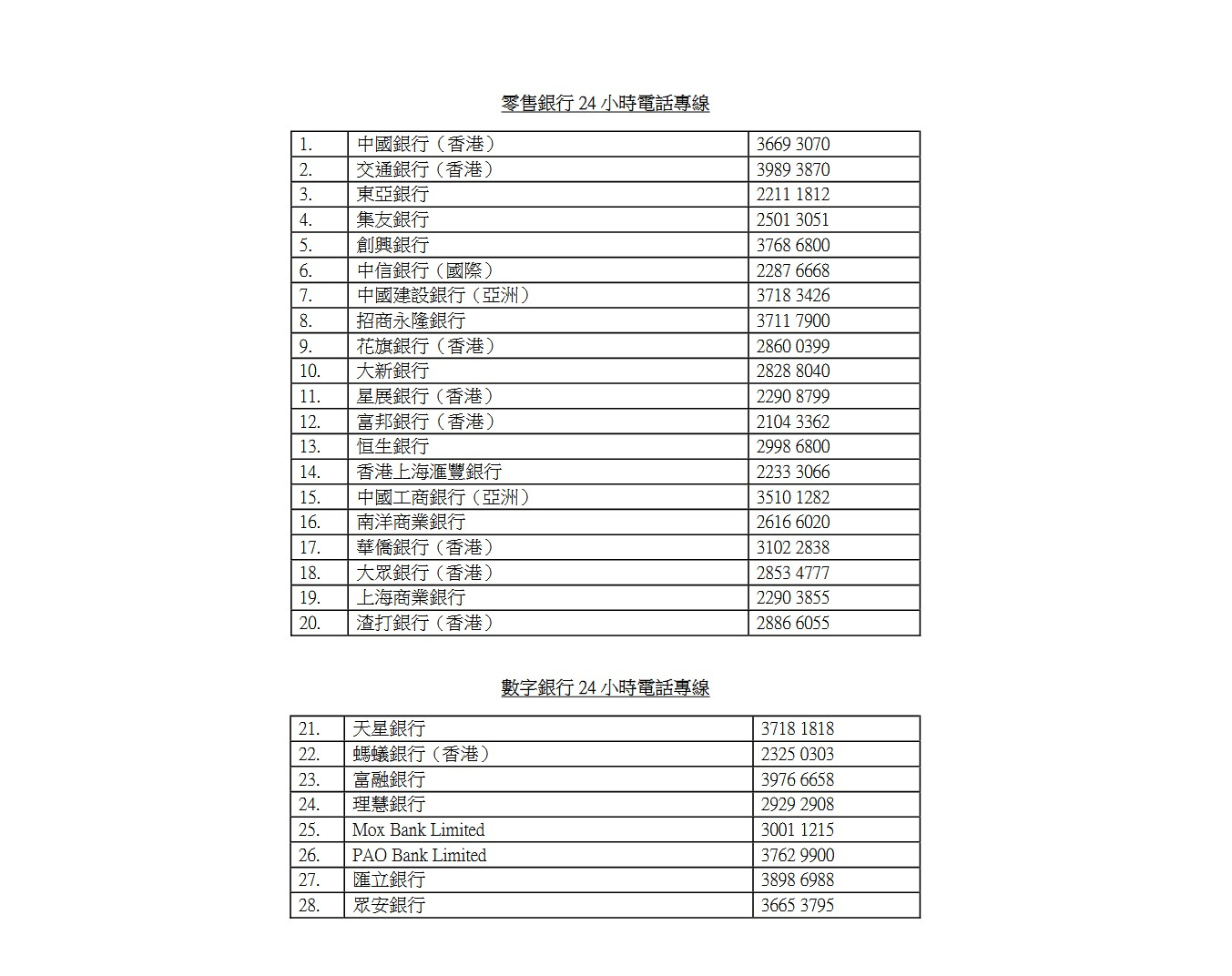 各零售銀行即日起成立內部專責小組,並開設24小時電話專線解答查詢,以及在分行、網頁及社交媒體公布支援措施詳情及更新;各銀行亦延長大埔區分行服務時間,明日服務時間延長至下午5時,星期日服務時間上午9時至下午1時,同時加派人手了解受災居民對銀行服務的特別需求。