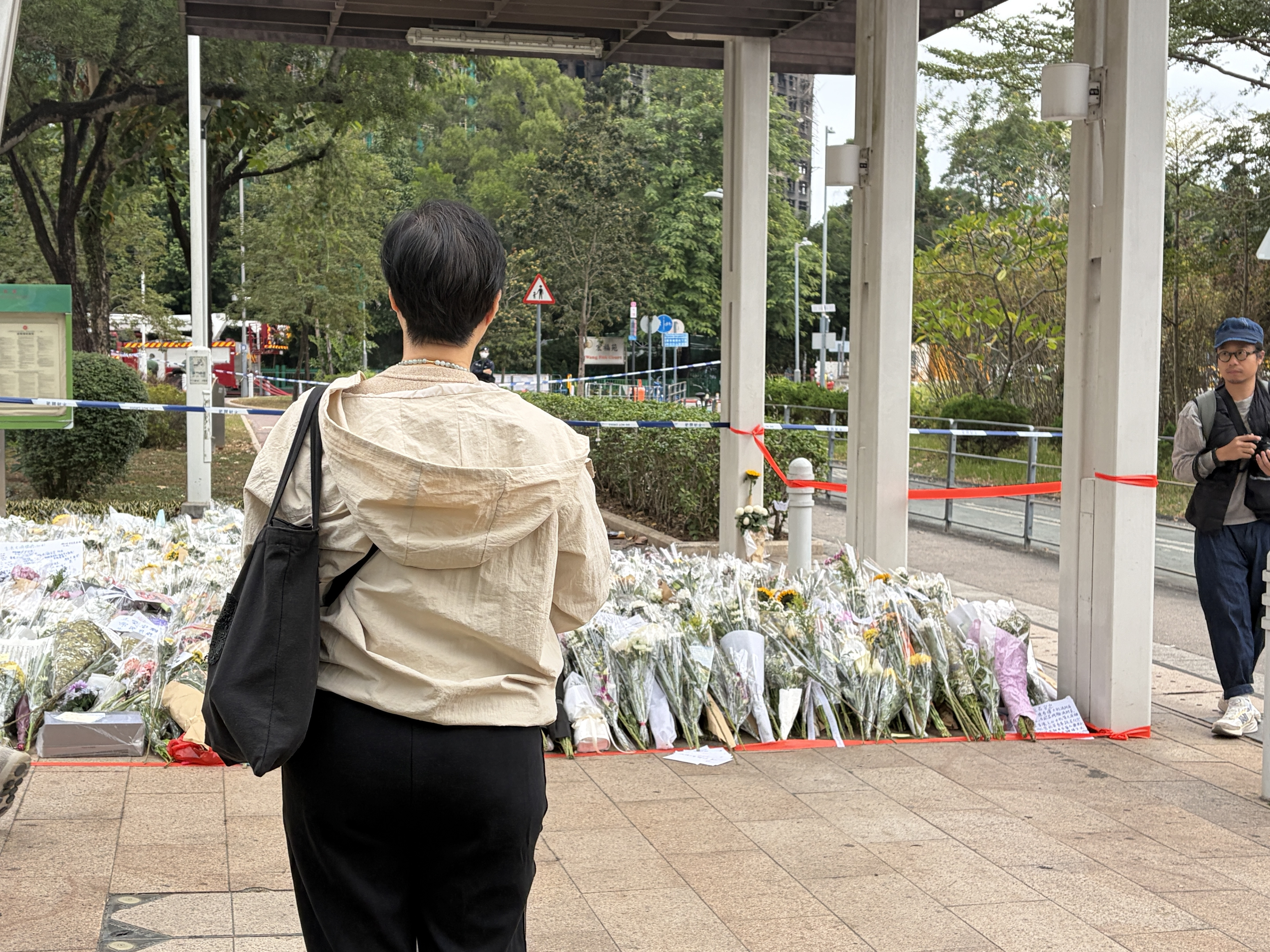 大埔宏福苑五級火警,大批市民上午帶同白色鮮花和心意卡,自發到涉事屋苑向受災居民及遇難者表達心意。