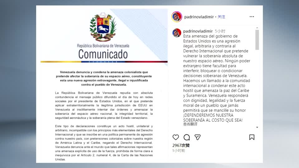 委內瑞拉副總統羅德里格斯表示,美國政府試圖阻斷委內瑞拉領空,構成對國家主權的非法與無理的干預。