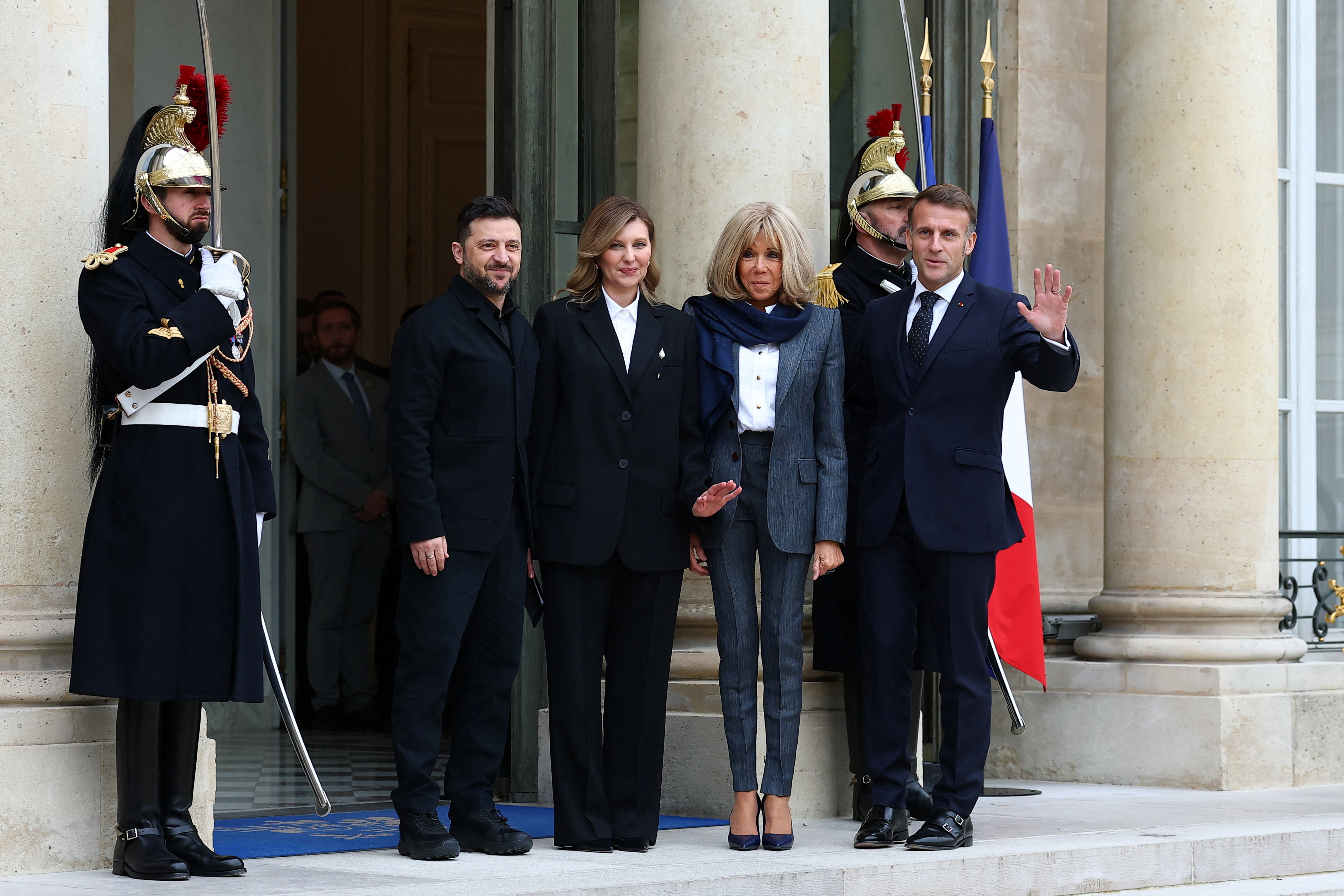 馬克龍與夫人在巴黎愛麗舍宮迎接澤連斯基夫婦,兩國領袖隨後舉行會談。(路透社)