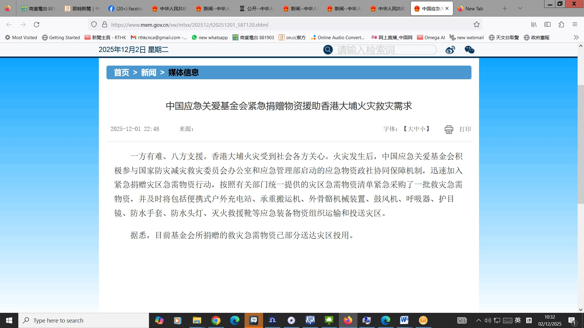 國家應急管理部表示,香港大埔火災發生後,中國應急關愛基金會積極參與國家防災減災救災委員會辦公室和應急管理部啓動的應急物資政社協同保障機制,迅速加入緊急捐贈災區急需物資行動。