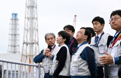 高市早苗(左二)昨日視察福島第一核電站,了解反應堆報廢工作的進度與核污水排海的情況。(法新社)