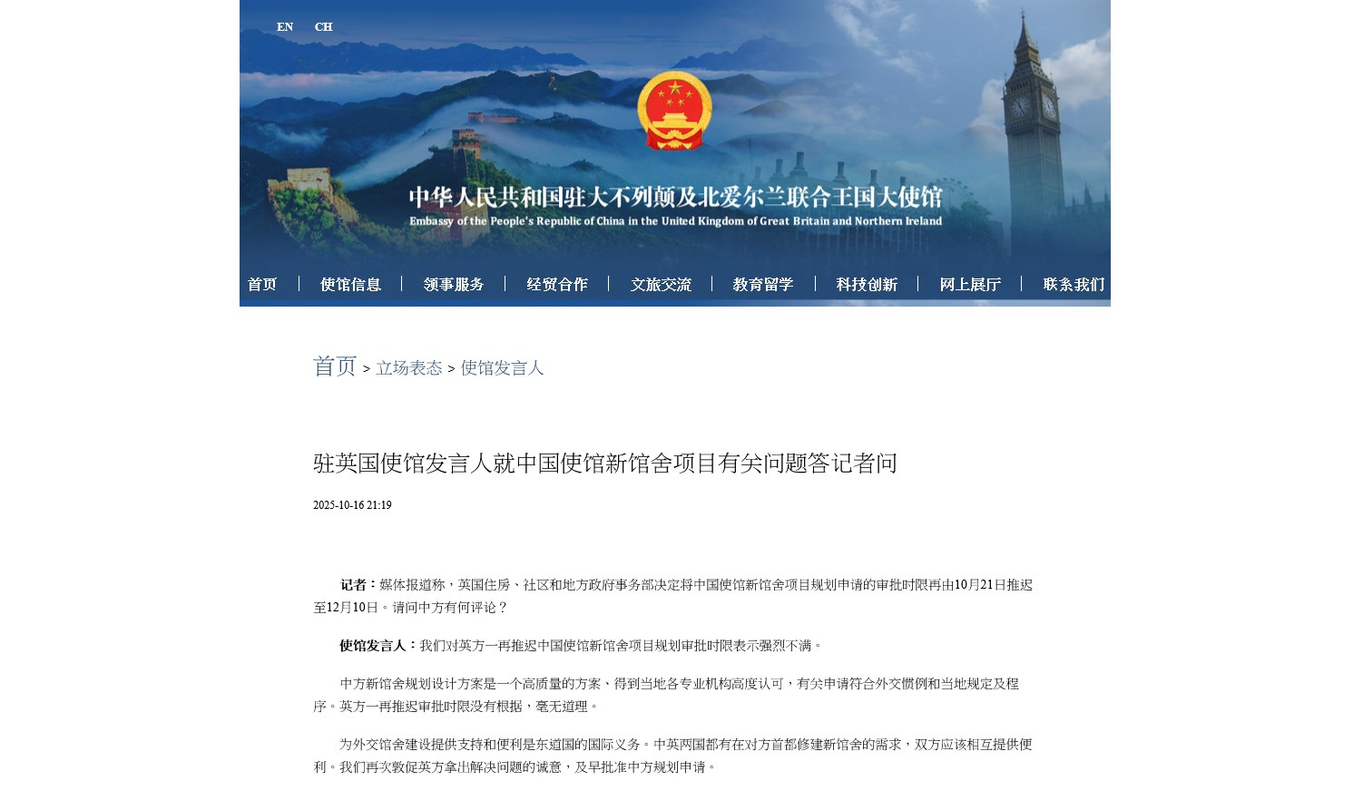 發言人表示,中方新館舍規劃設計方案是一個高質量方案、得到當地各專業機構高度認可,有關申請符合外交慣例和當地規定及程序。為外交館舍建設提供支持和便利是東道國的國際義務。中英兩國都有在對方首都修建新館舍的需求,雙方應該相互提供便利。
