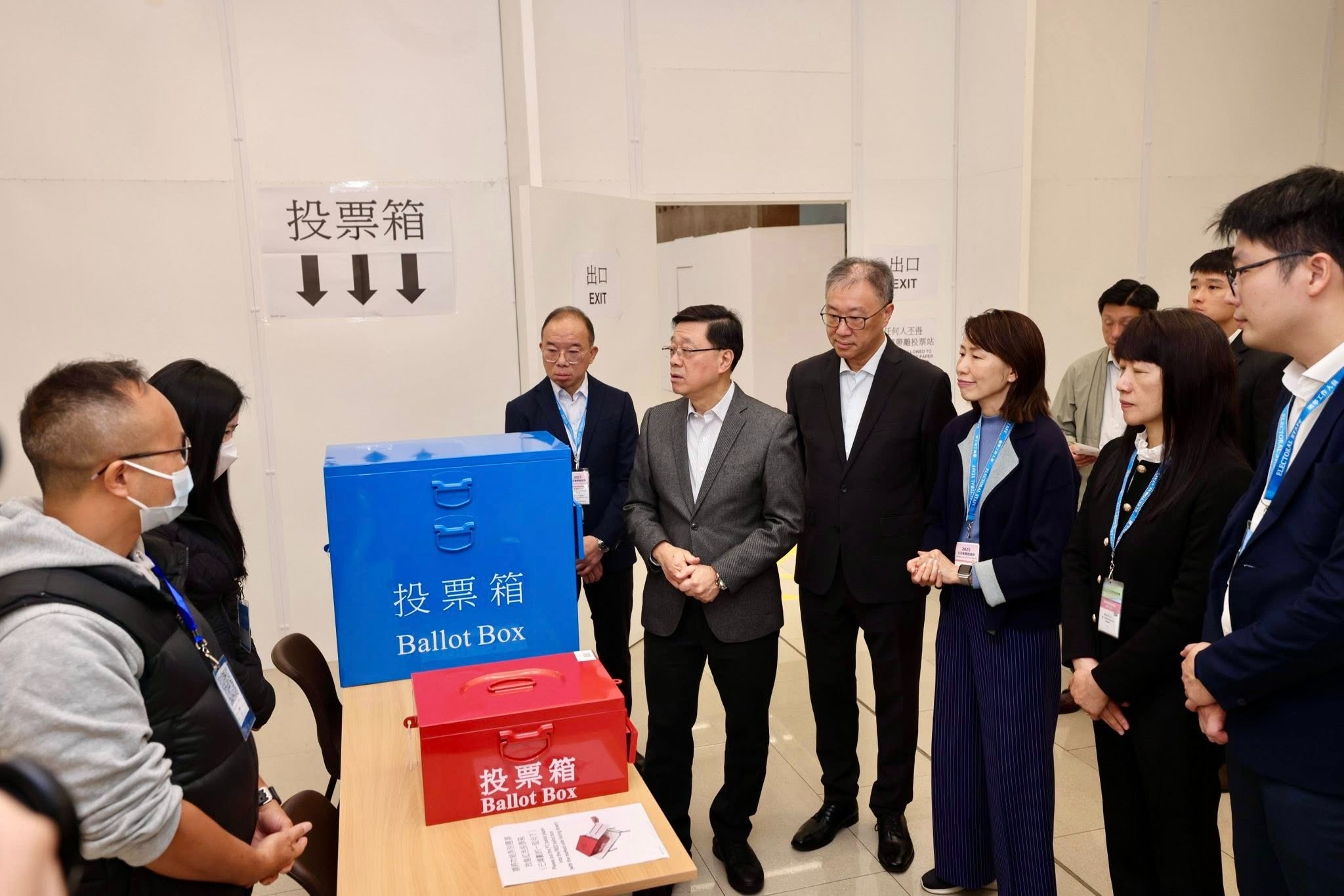 明天是立法會換屆選舉投票日。政制及內地事務局局長曾國衞早上與選管會主席陸啟康,陪同行政長官李家超到設於港珠澳大橋香港口岸旅檢大樓的鄰近邊境投票站,和位於東涌文東路體育館的一般投票站視察場地。