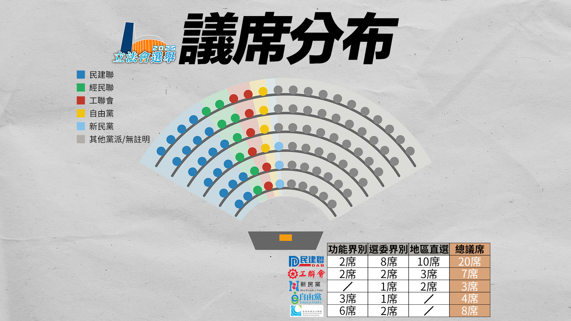 經民聯有8席成為第二大黨,工聯會有7席,新民黨的議席由現屆的6席減半至3席。