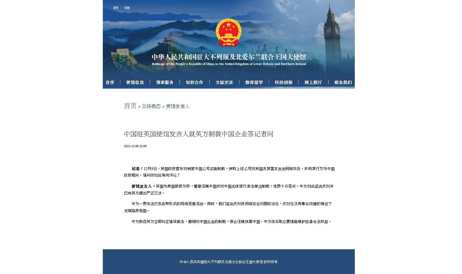 中國駐英國使館批評英國蓄意誣衊中國,並對中國實體進行非法單邊制裁,性質十分惡劣。中方堅決反對並已向英方提出嚴正交涉。