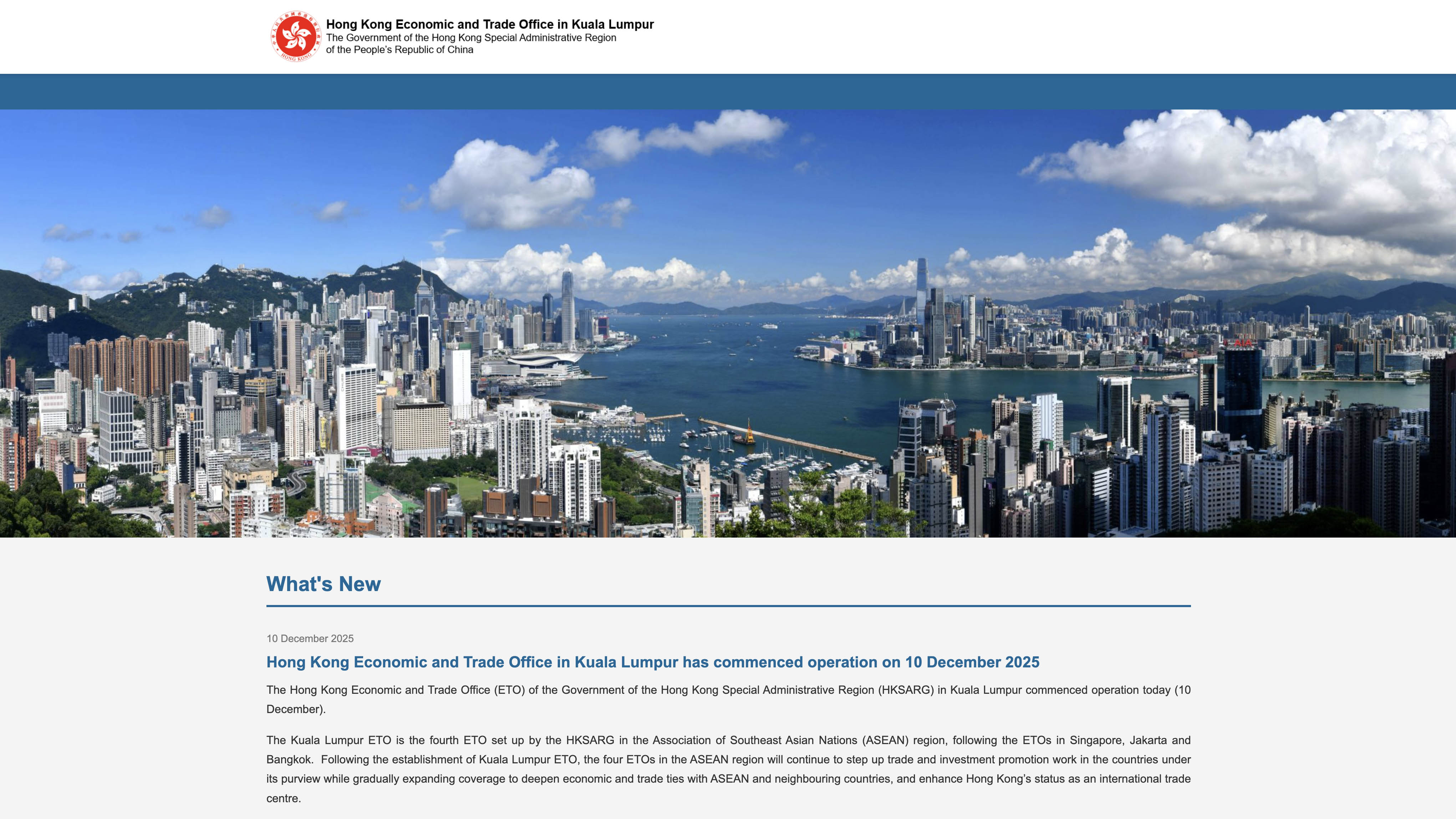 商務及經濟發展局局長丘應樺表示,施政報告公布特區政府會在今年成立駐吉隆坡經貿辦。駐吉隆坡經貿辦是繼駐新加坡、雅加達及曼谷經貿辦後,在東南亞國家聯盟地區設立的第4個經貿辦,有助加強香港與東盟的經貿聯繫。