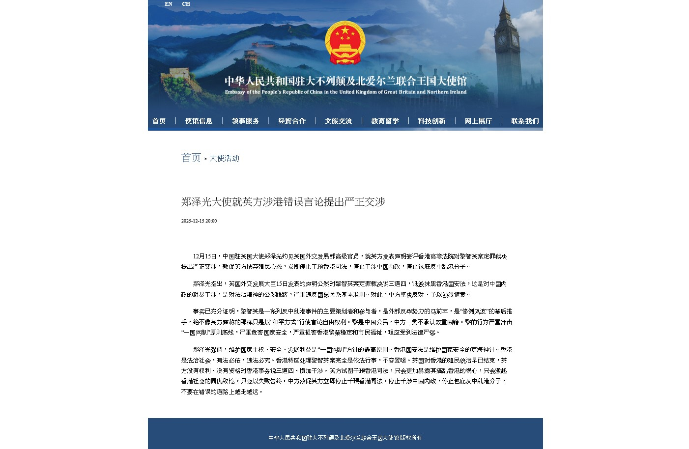 中國駐英國大使鄭澤光約見英國外交發展部高級官員,就英方發表聲明妄評香港高等法院對黎智英案定罪裁決提出嚴正交涉,敦促英方擯棄殖民心態,立即停止干預香港司法,停止干涉中國內政,停止包庇反中亂港分子。