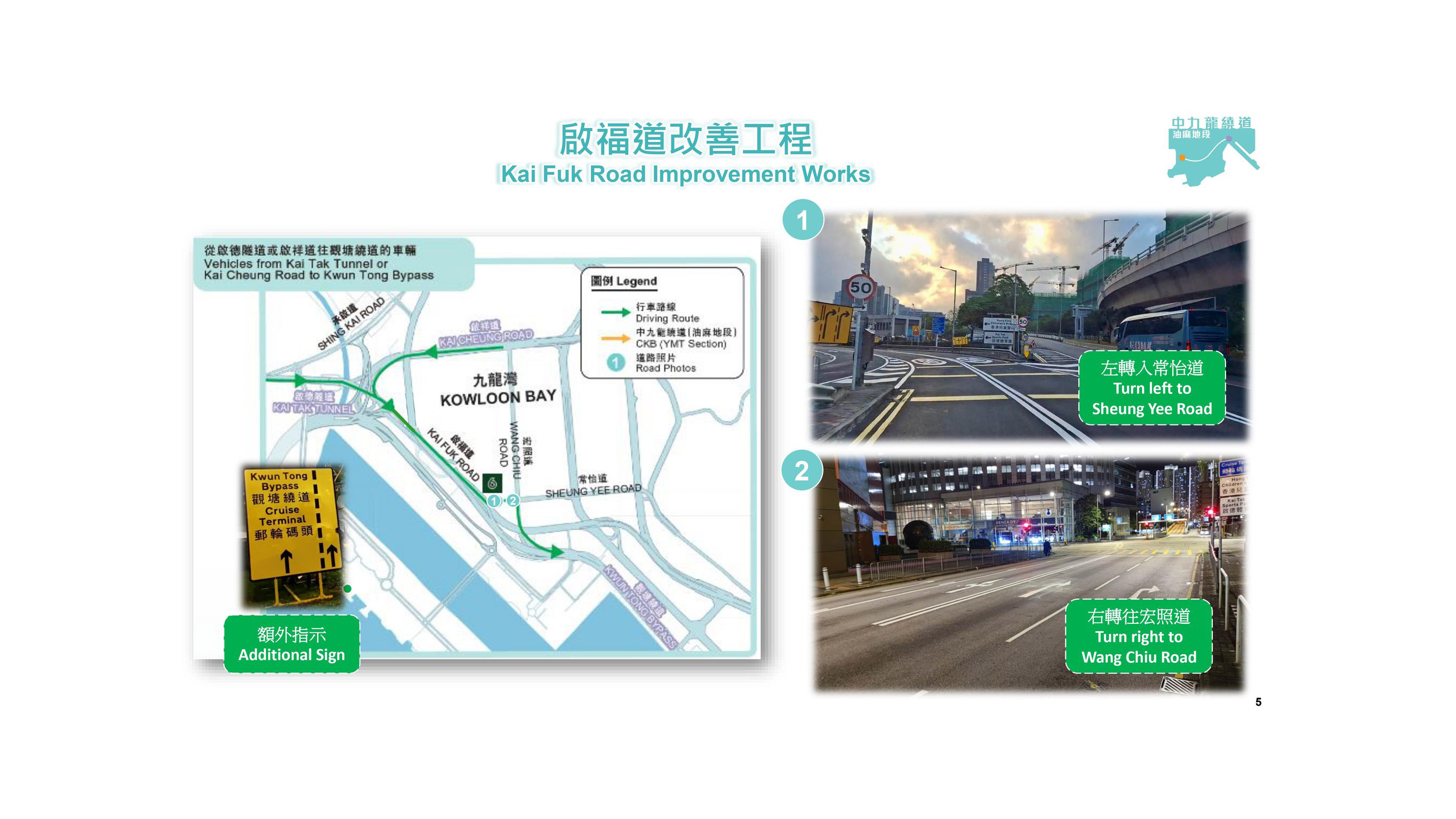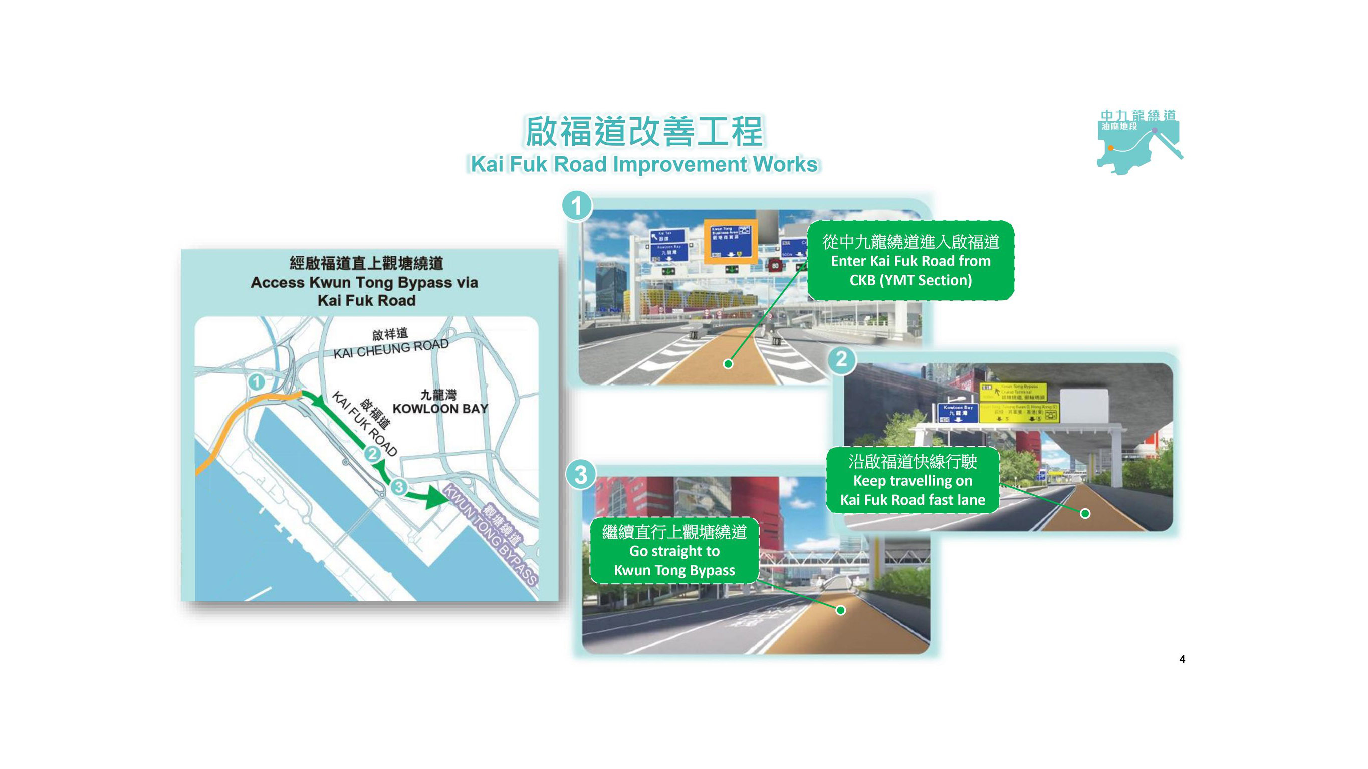 中九龍繞道(油麻地段)星期日通車,運輸署提醒,由中九繞道往觀塘繞道的車輛,啟福道東行快線將於開通日改為雙白線,駕駛者沿快線可直上觀塘繞道;由啟德隧道或啟祥道往觀塘繞道的車輛,可於啟福道靠左行駛,左轉入常怡道,再經宏照道使用下一個入口上觀塘繞道。