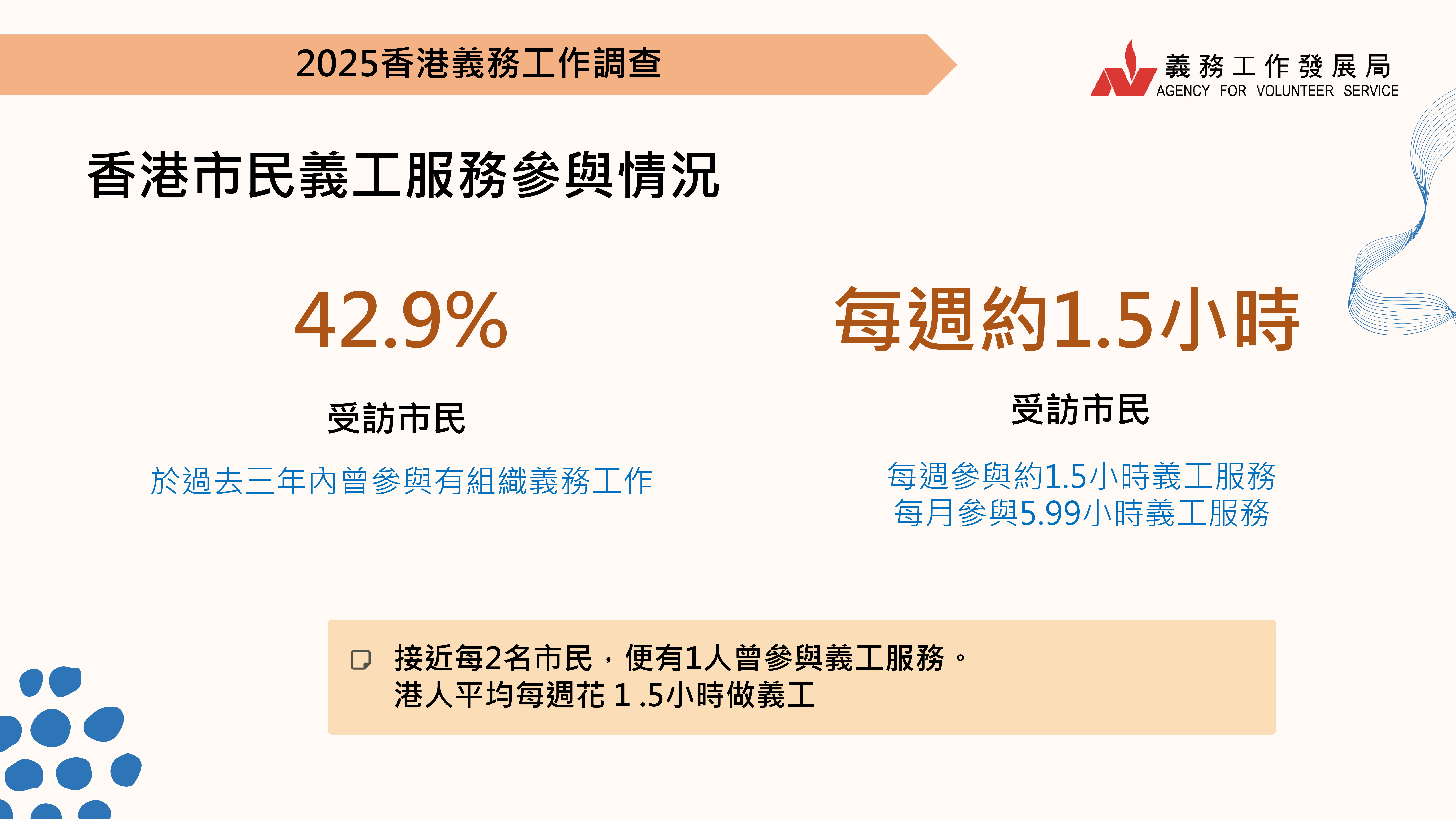 義務工作發展局委託香港恒生大學團隊獨立進行的「2025香港義務工作調查」,發現約43%受訪市民過去3年曾做義工,平均每周花約1.5小時。去年推出的「香港義工指數」,今年微升至100.28,包括市民對義務工作的興趣度均有上升,整體更肯定義工的社會價值,更願意幫助弱勢群體。