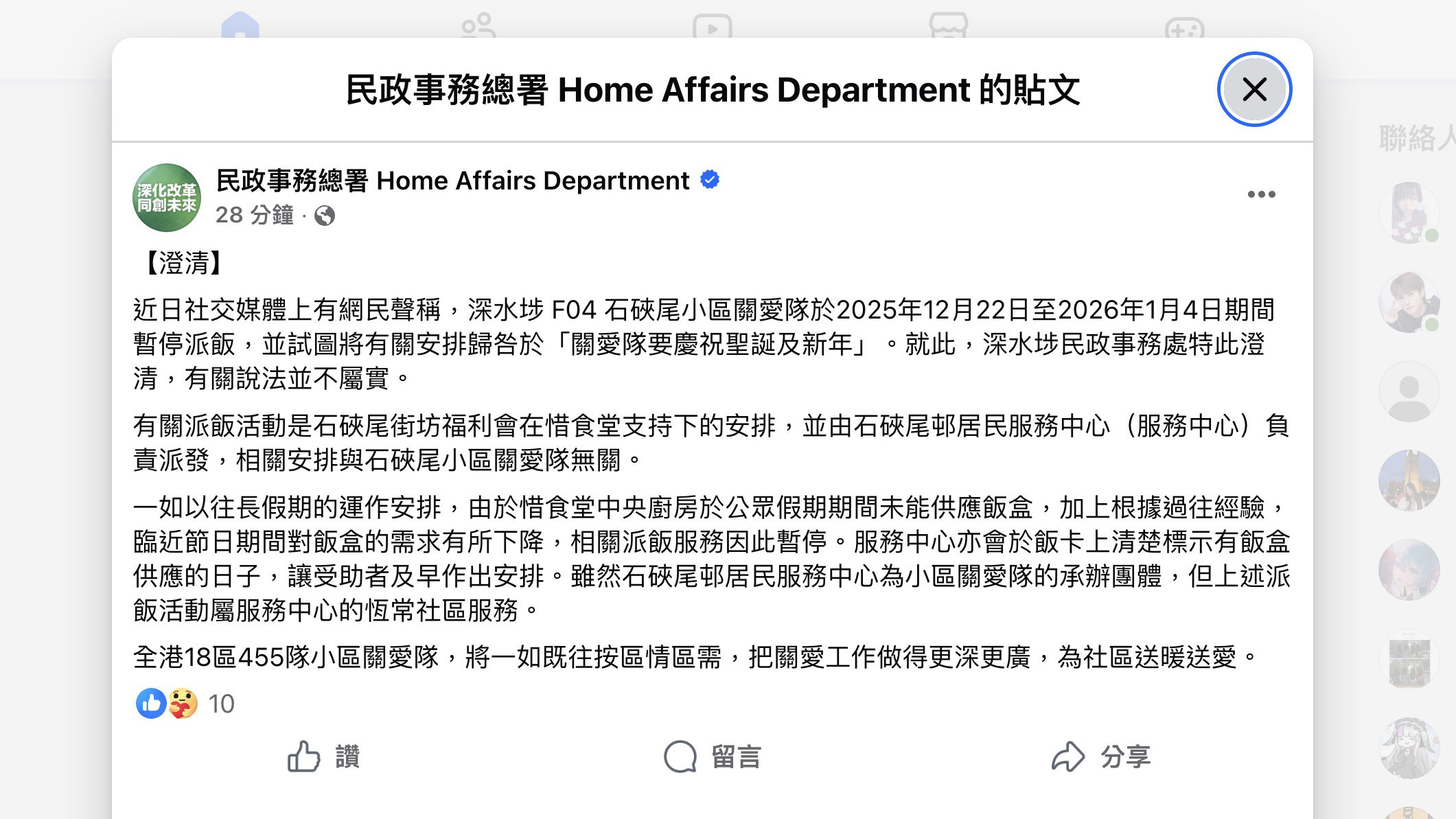 民政事務總署表示,近日有網民聲稱深水埗石硤尾小區關愛隊於12月22日至明年1月4日期間暫停派飯,並試圖將有關安排歸咎於「關愛隊要慶祝聖誕及新年」,深水埗民政事務處澄清,指有關說法並不屬實。