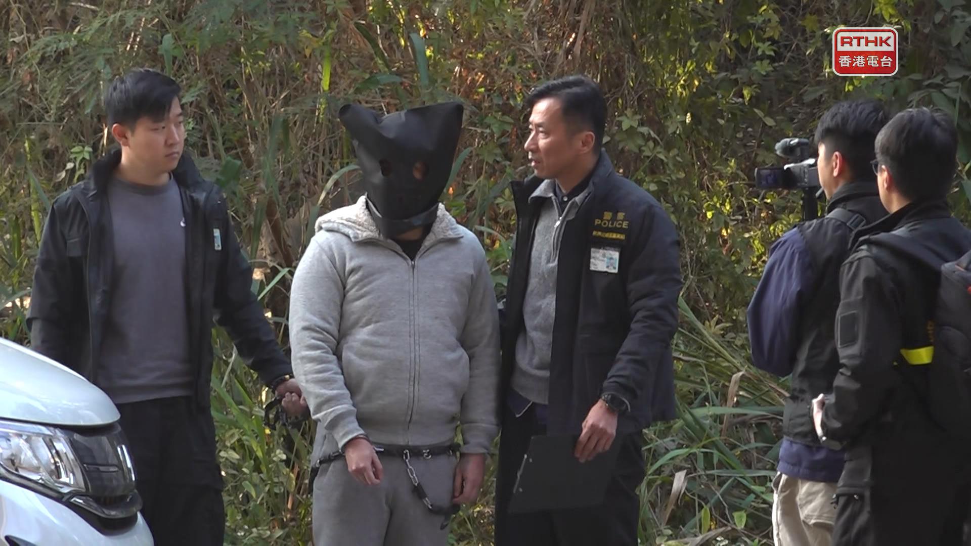 被捕男子黑布蒙頭、身穿灰色外衣和長褲,被鎖上鐵鏈、由探員押解乘坐一輛白色七人車到場,離開車廂後不時指向私家車方向,期間向探員講述情況,之後又將一個假人道具從車上拉出車外。