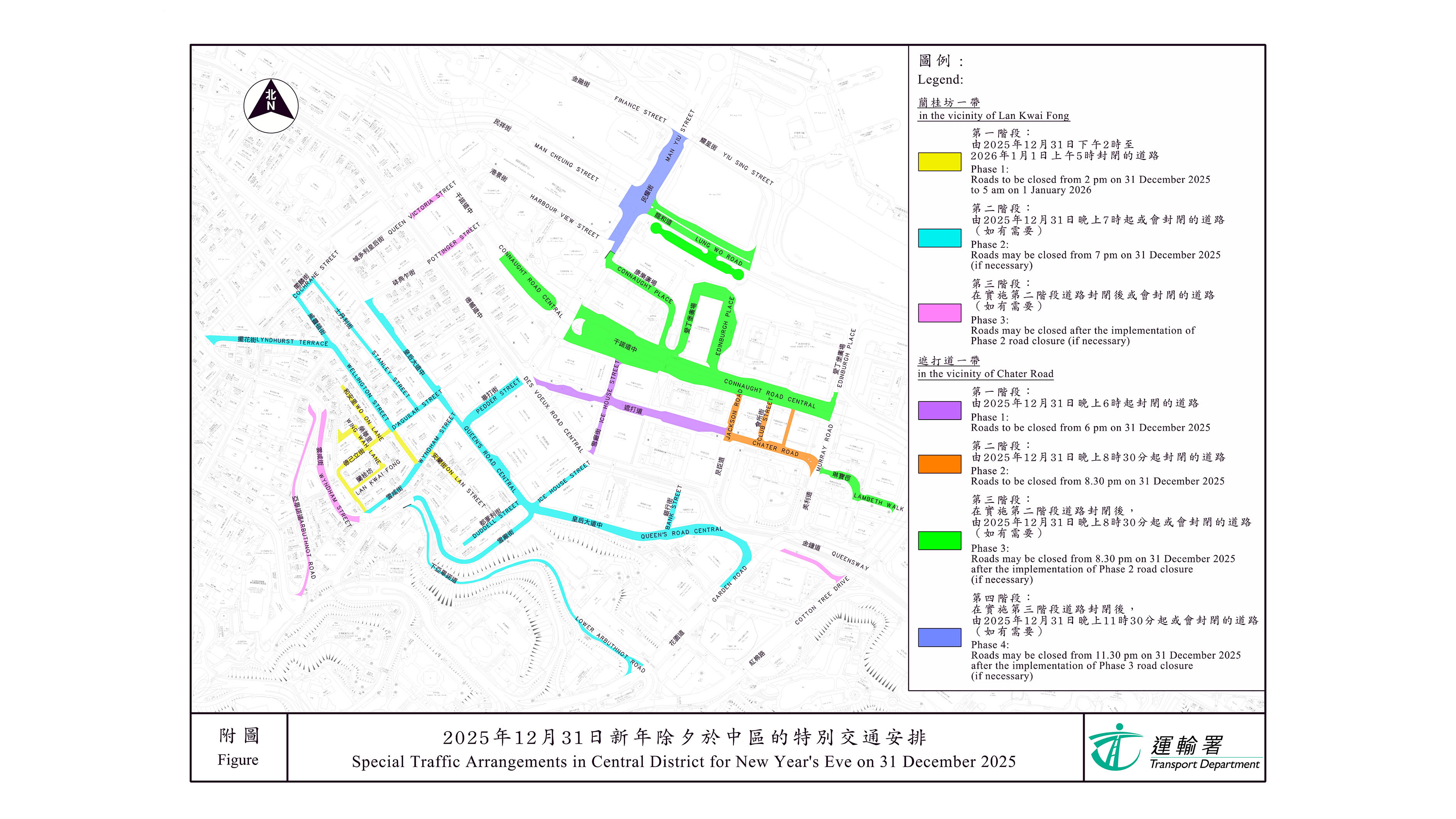 今日除夕,旅發局在中環有跨年倒數活動,中環部分路段下午起會分階段封路及改道。