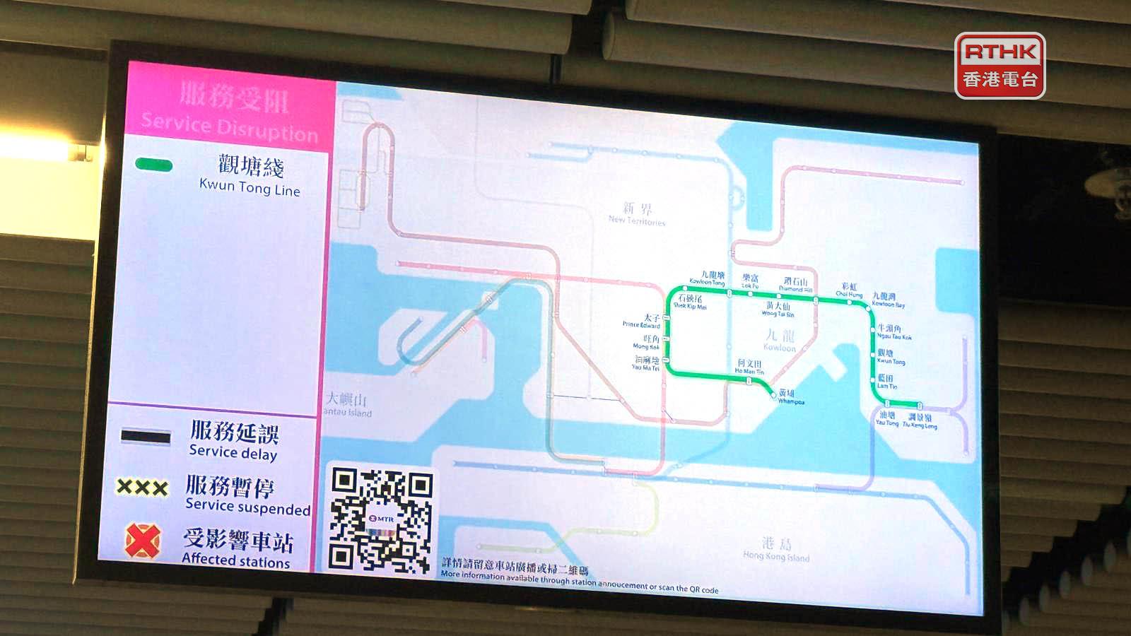 港鐵表示,由於觀塘綫牛頭角站與九龍灣站之間有信號設備運作不暢順,列車經過有關路段時要以較慢速度行駛,觀塘綫的整體行車時間預計需要額外5至8分鐘。