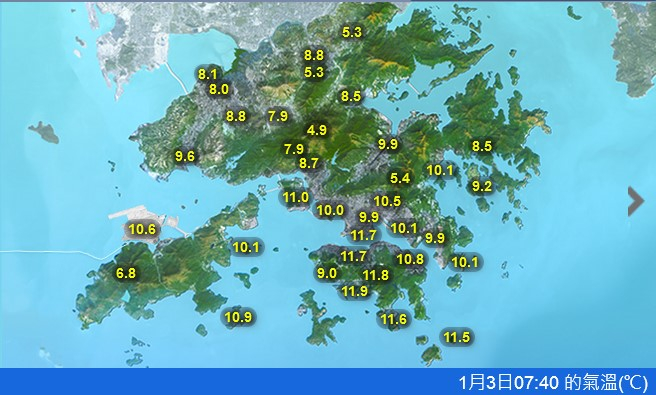 新界多區氣溫介乎8度至9度,北區打鼓嶺只有5.3度,大帽山4.1度。