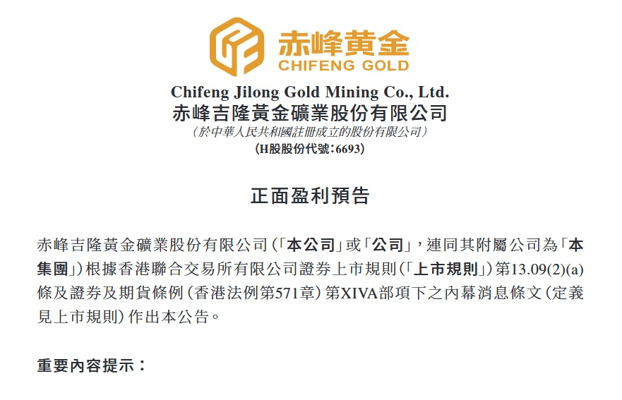 赤峰黃金預計,去年度盈利介乎30億至32億元人民幣,按年增加約70%至81%。