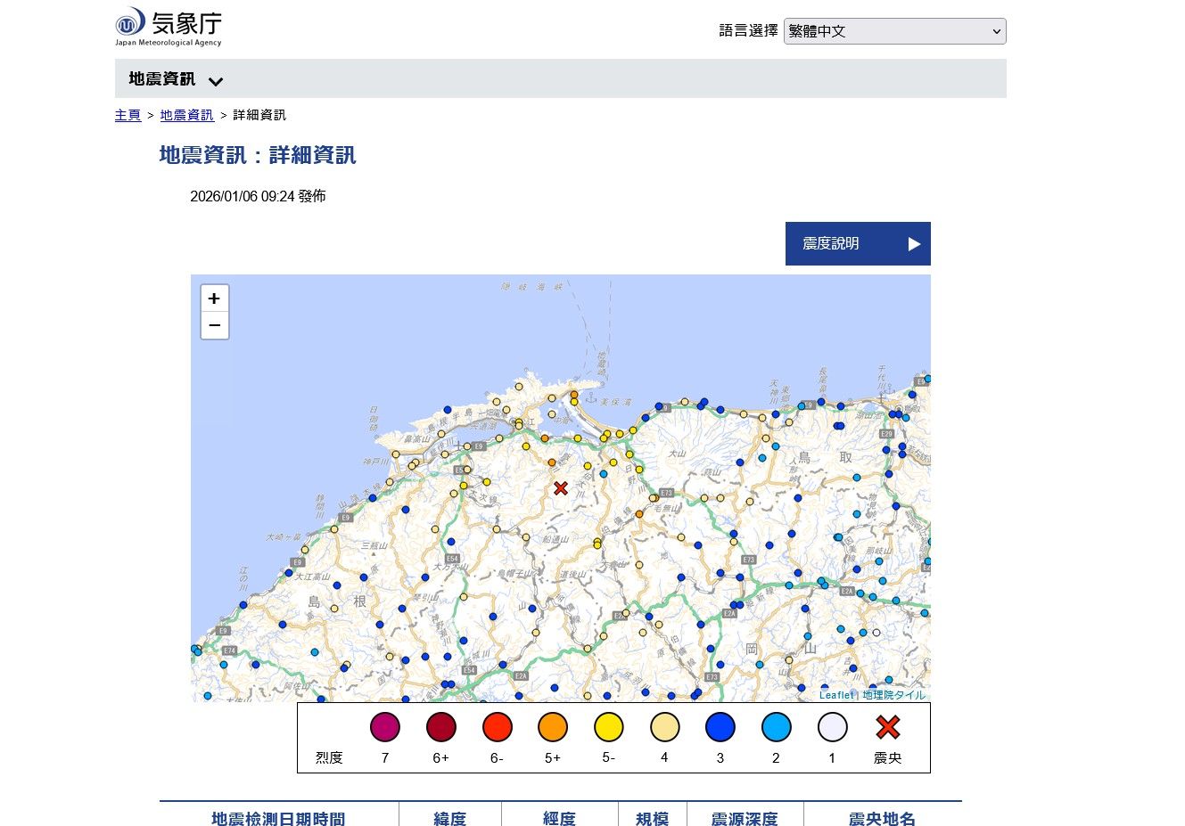 日本氣象廳稱,地震震央位於島根縣東部。