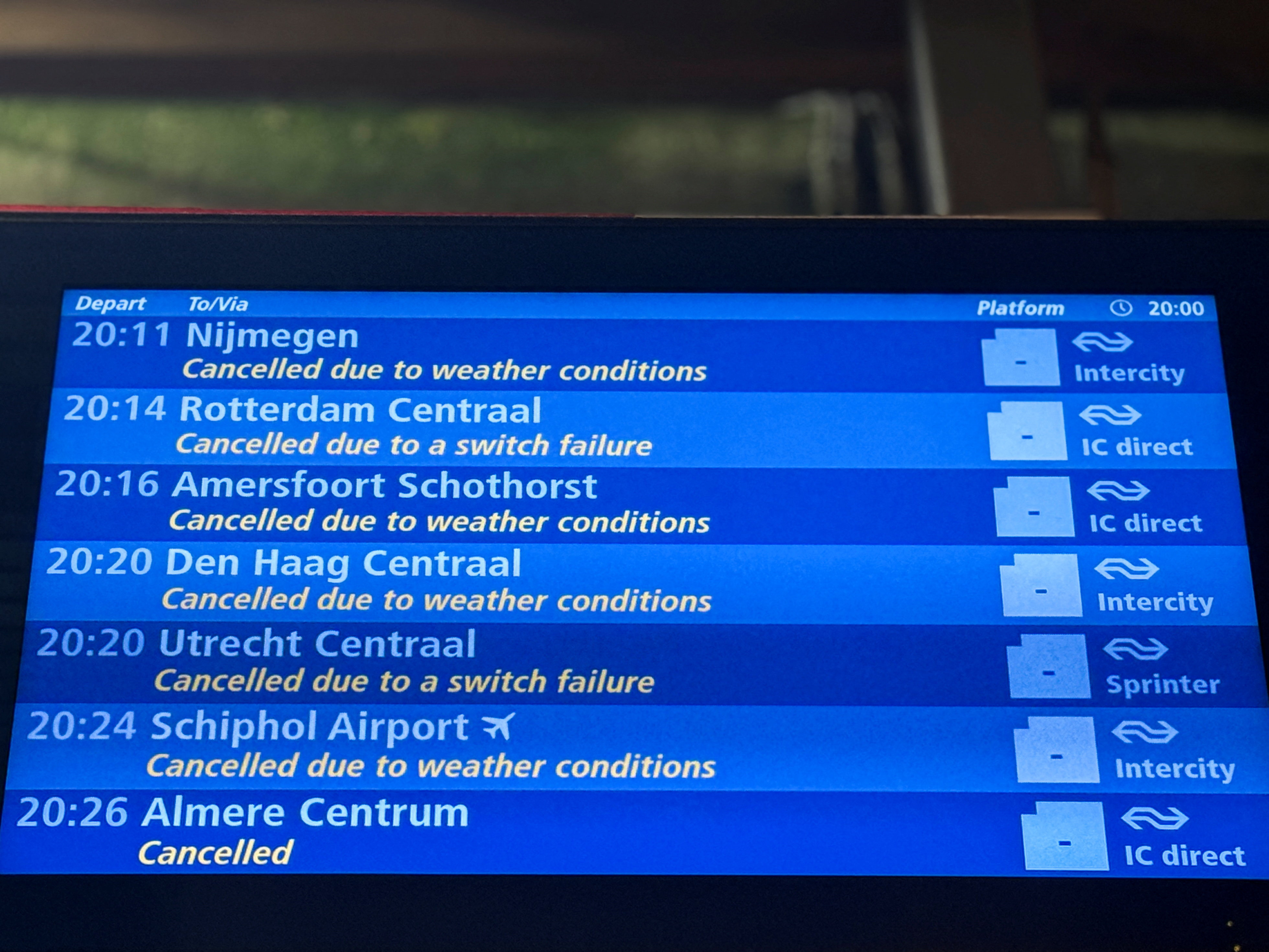 在歐洲最繁忙航運樞紐之一、荷蘭阿姆斯特丹史基浦機場,大量航班取消,阿姆斯特丹周邊列車停駛。