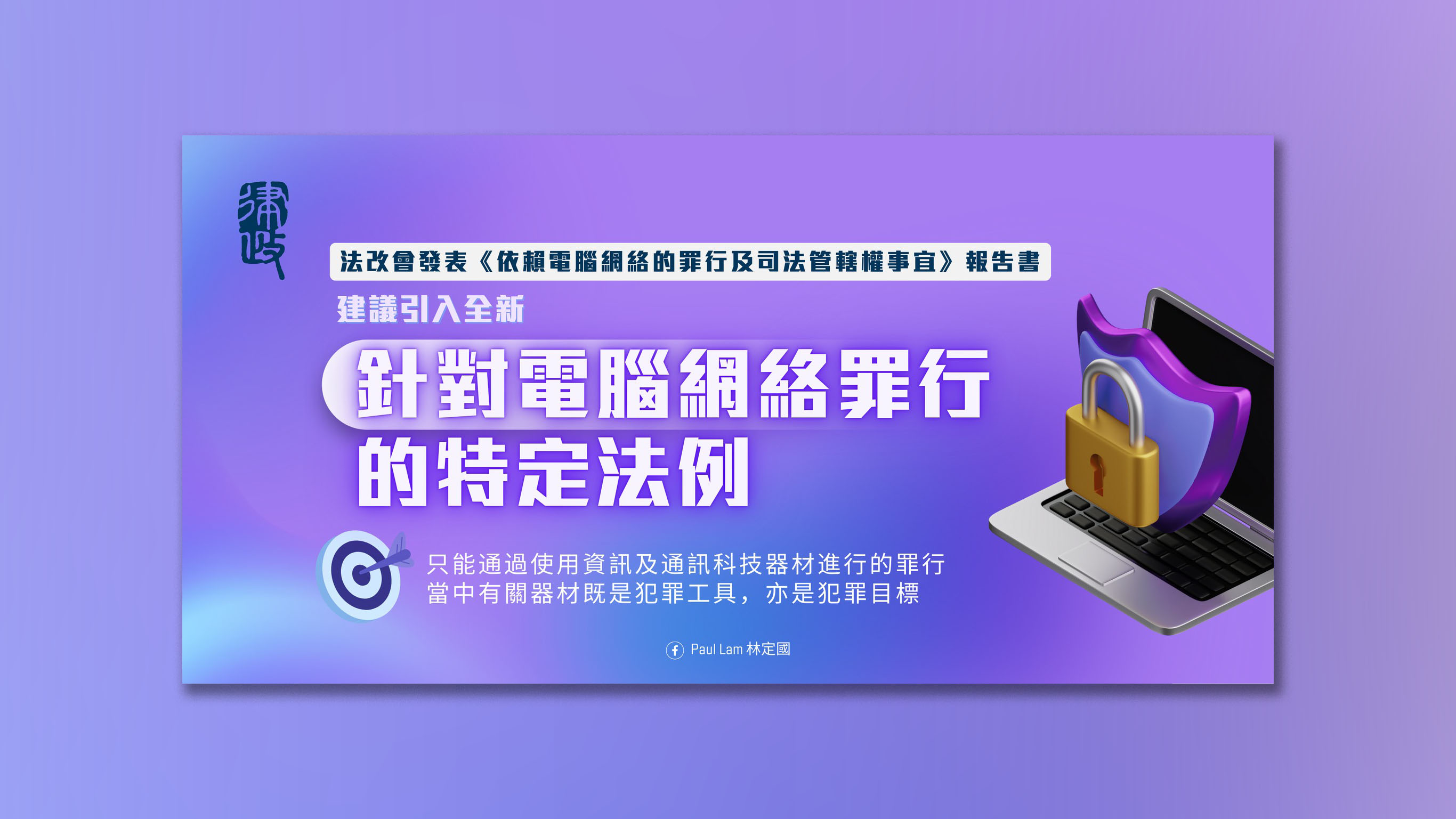 法改會建議引入全新針對電腦網絡罪行的特定法例,以涵蓋5類依賴電腦網絡的罪行。律政司司長林定國表示,現時不同的電腦相關罪行在香港的《刑事罪行條例》及《電訊條例》中訂立,部分已不合時宜,而部分司法管轄區均已制定針對電腦網絡罪行的特定法例,或透過其成文法典的專門部分處理電腦網絡罪行,藉此就該5類依賴電腦網絡的罪行及其相關司法管轄權事宜,訂定條文。