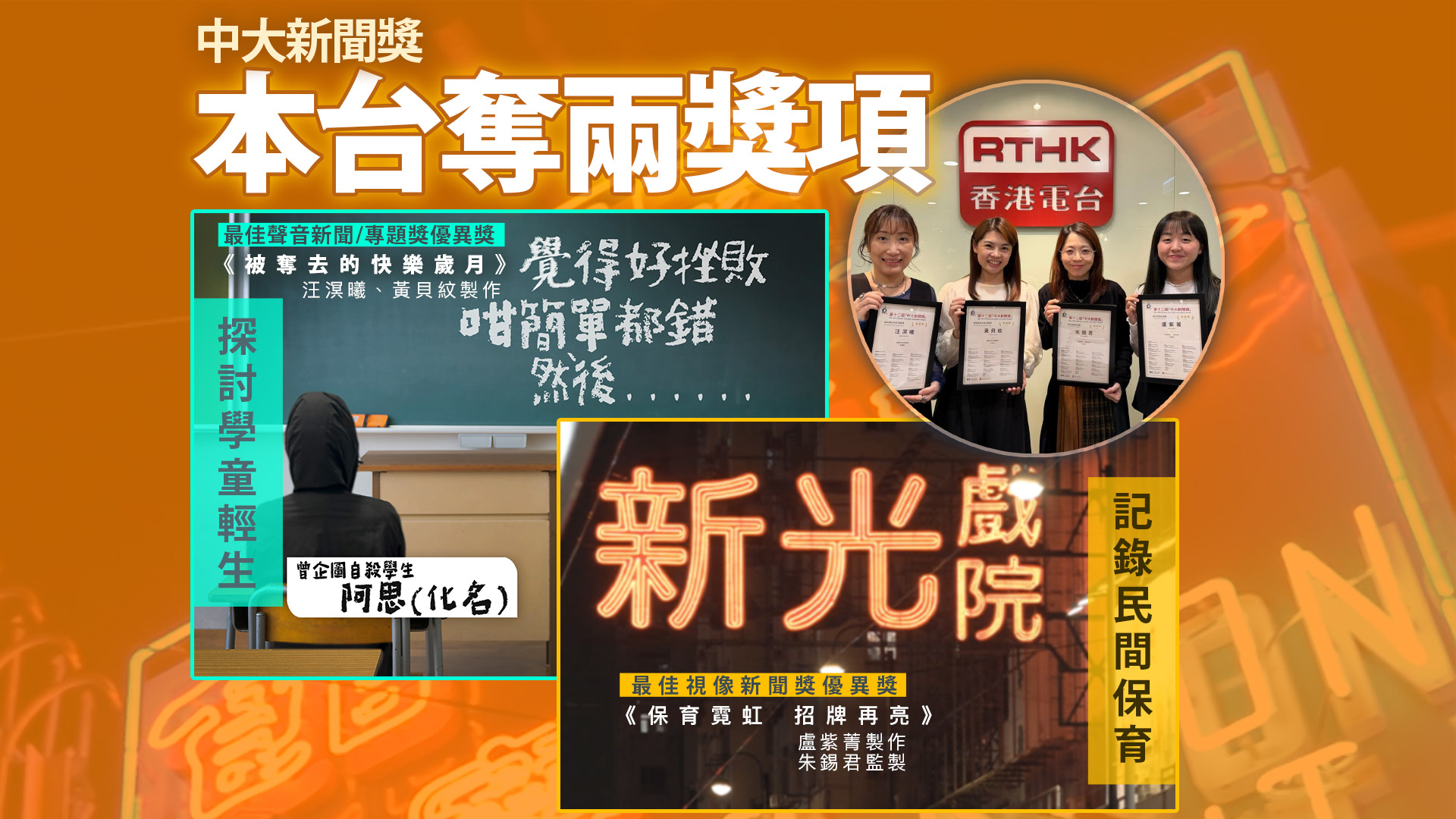 於2024年底播出的《保育霓虹 招牌再亮》視像新聞,奪得「最佳視像新聞獎優異獎」,作品由本台中文新聞及時事記者盧紫菁製作,朱錫君監製。