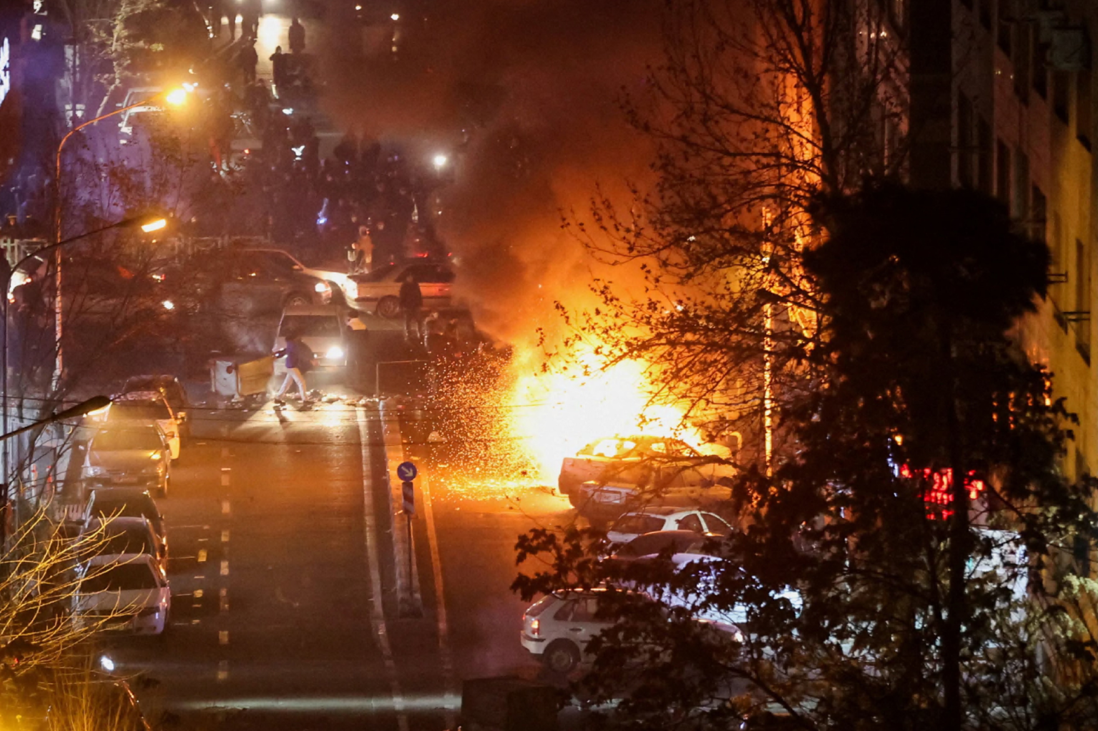 路透社報道指由第三方提供的相片顯示,伊朗首都德黑蘭街頭日前有汽車著火焚燒。(路透社)