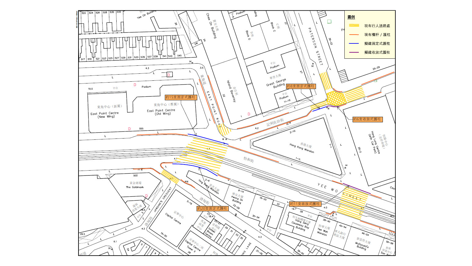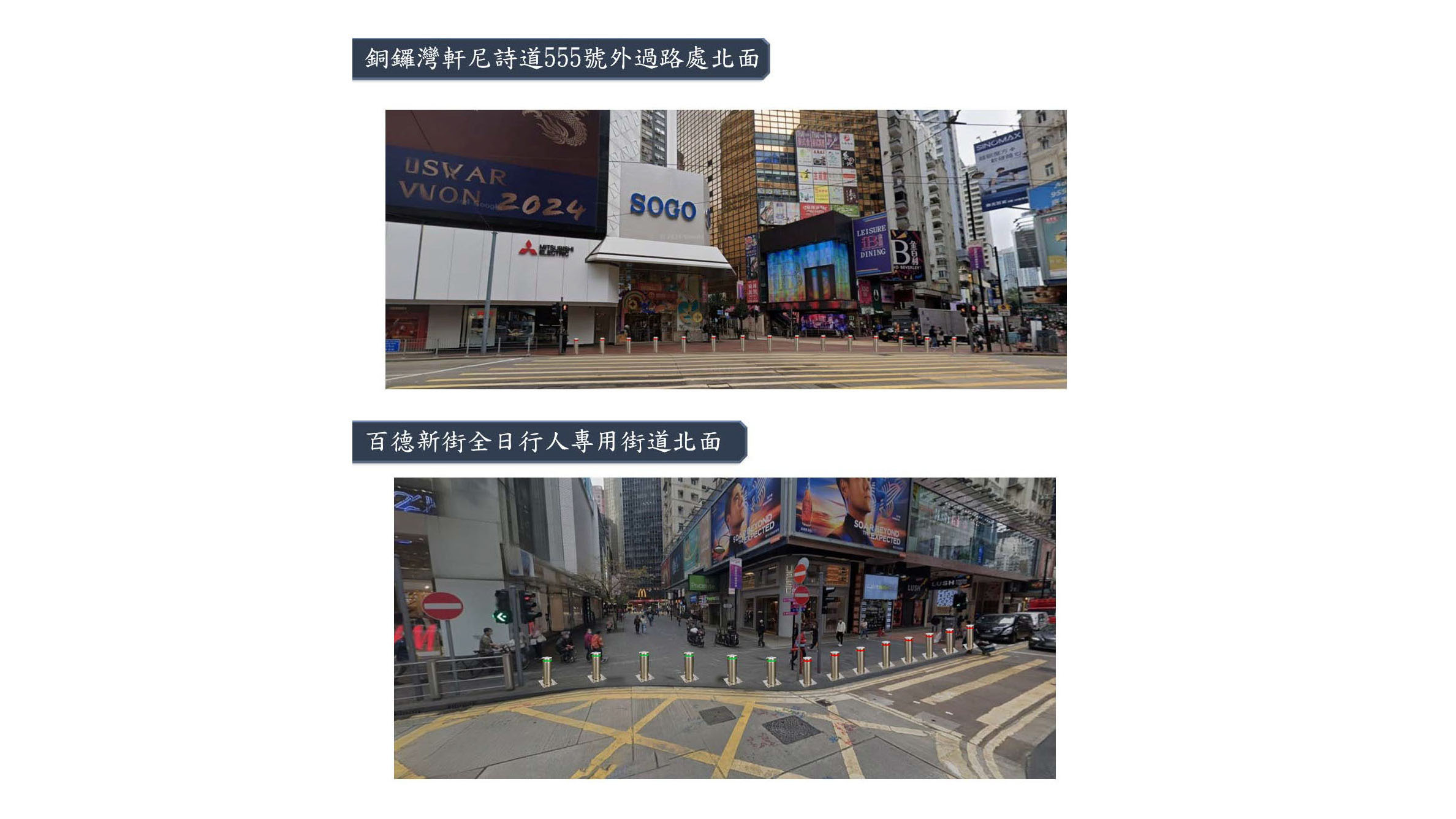 政府計劃在銅鑼灣崇光百貨對出的過路處和百德新街行人專用街道,安裝汽車防撞設施,例如防撞欄或護柱,工程總開支約500萬元,預計今年第四季完成。