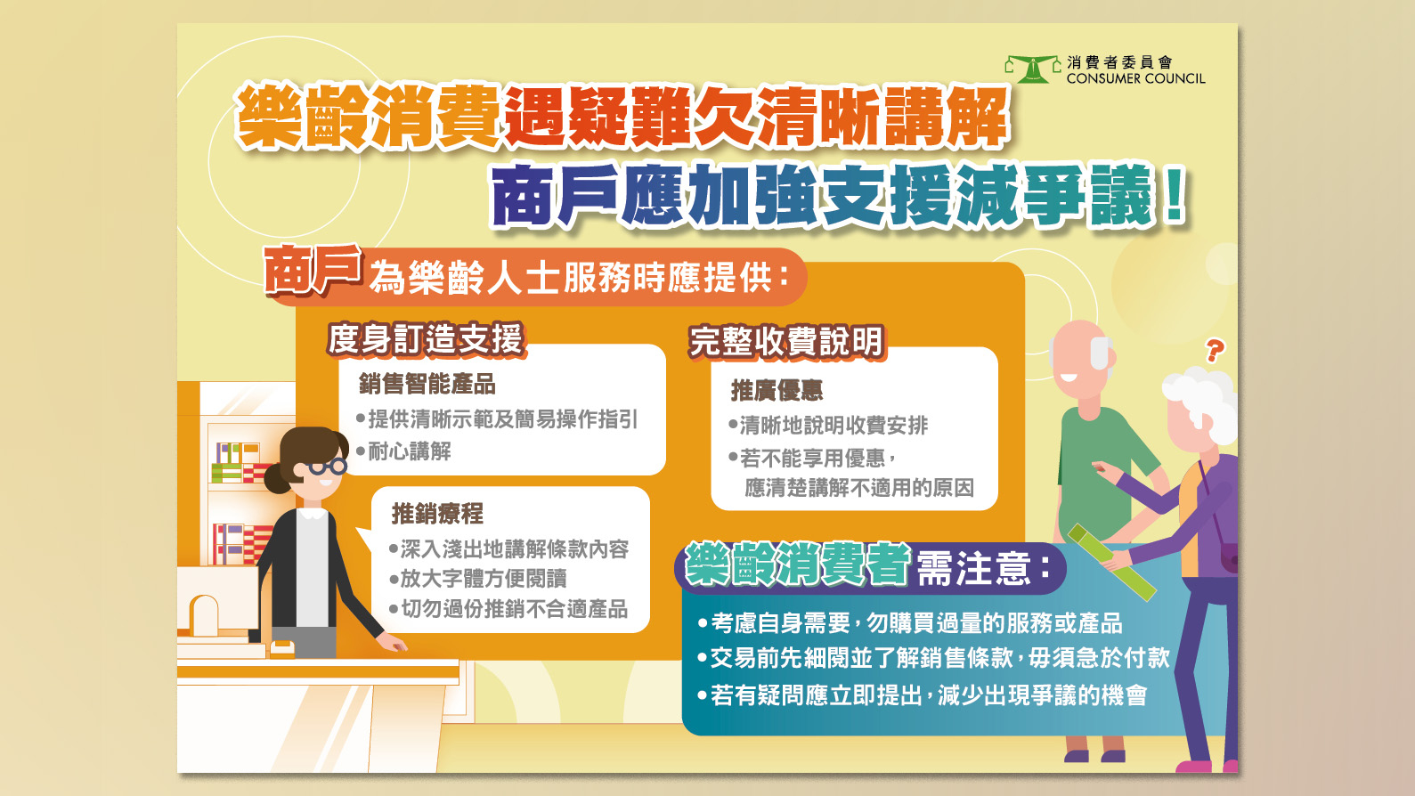 消委會呼籲商戶檢視銷售政策,為樂齡人士提供支援,在推銷療程或服務時亦應深入淺出講解合約條款,並放大合約條款字體。樂齡消費者亦要考慮自身需要,勿買過量服務或產品,交易前詳細了解銷售條款,別急於付款等。