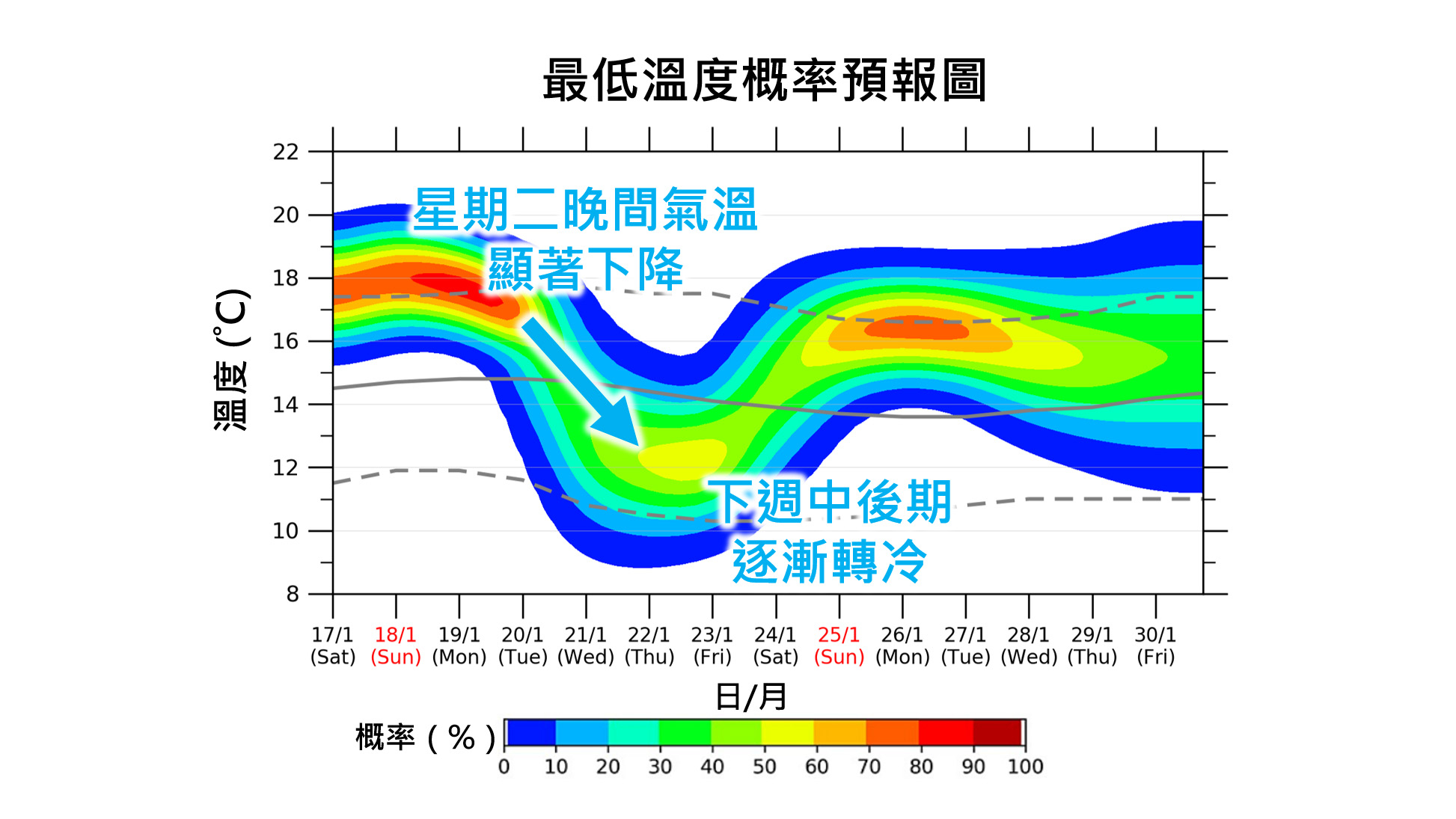 天文台說,根據現時最新的電腦預報模式預測,下週二當天一股冬季季候風的「先遣部隊」將以東風潮的形式抵達廣東沿岸,本港東風將會增強;隨後冷空氣的主力將會在下週三起逐漸影響廣東,該區將轉為北風形勢,氣溫顯著下降。不過天文台指出,目前各預報模式對於本地風向的預測仍有分歧,較多電腦模式預測星期三的北風形勢較為顯著,降溫幅度會較大,但部分電腦模式如人工智能電腦模式「風烏」則預測東風潮較為持續,降溫會較遲、幅度亦可能較小。