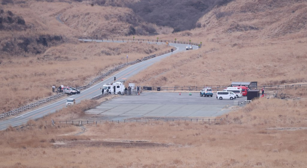 當局搜尋機上失聯人士,警方、消防和救護車在阿蘇山附近一帶。(法新社)