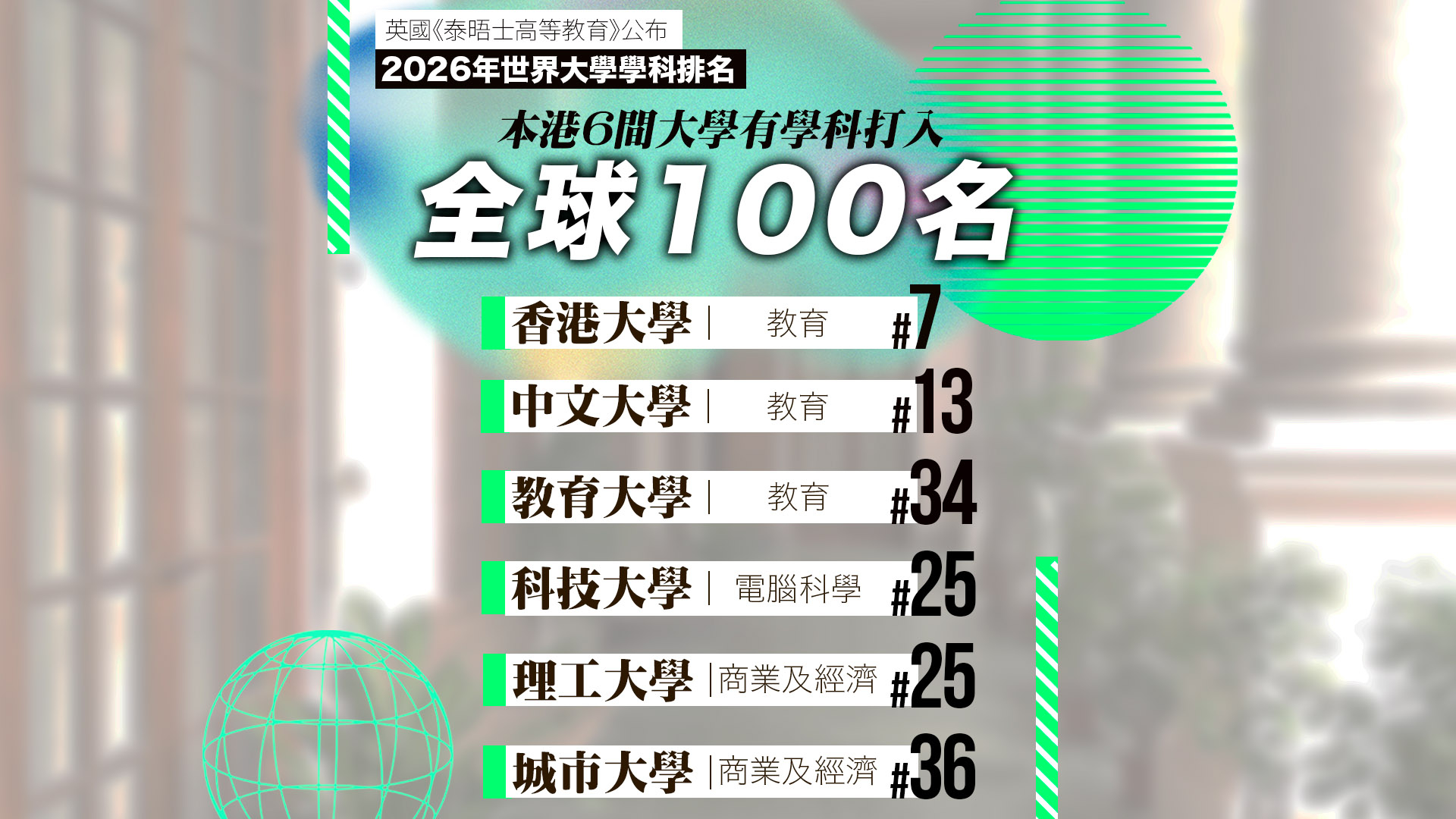 英國《泰晤士高等教育》公布2026年世界大學學科排名。本港8間資助大學在11個學科範疇分別有上榜。香港大學教育學位列全球第7,是全港唯一院校有學科躋身全球前10名。港大表示,會持續提升港大在全球高等教育領域的領導地位,全力吸引、培育未來領袖。