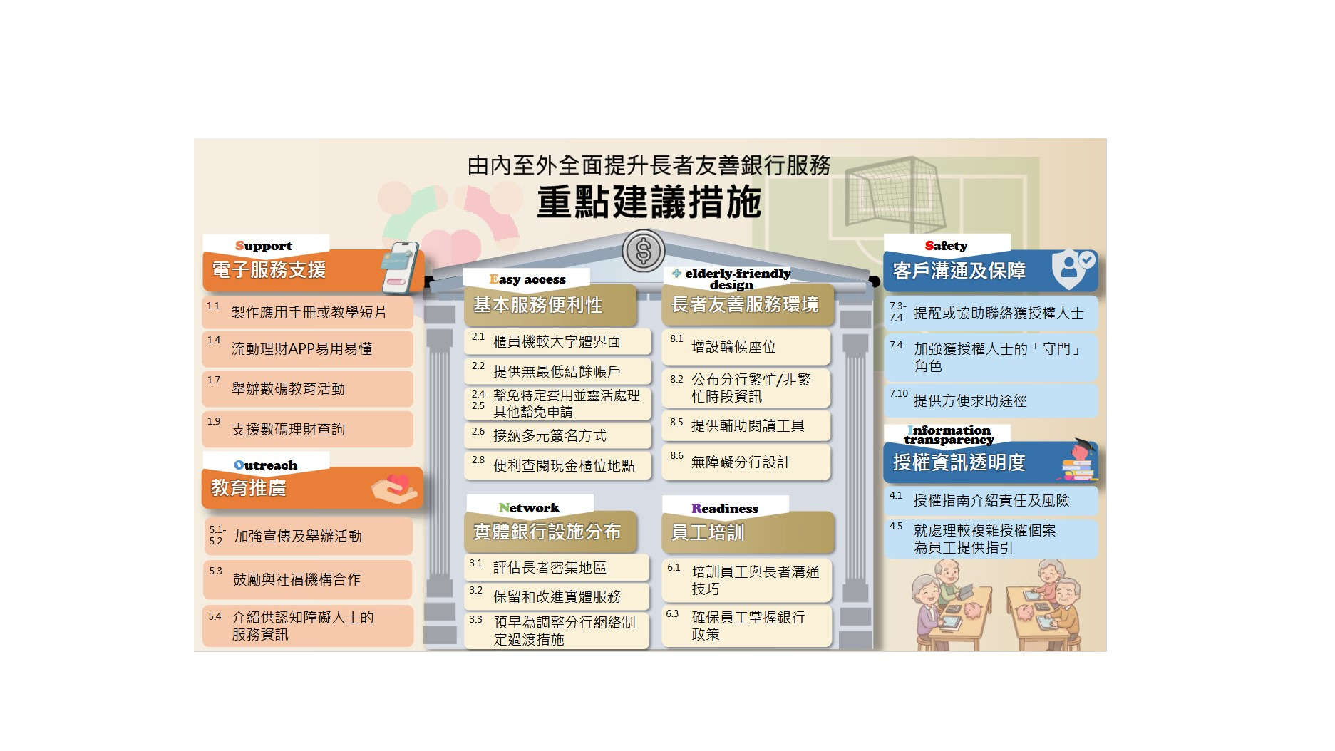 《長者友善銀行服務指引》列載銀行應採納的8項主要原則及多項建議措施,透過加強金融教育,協助長者掌握金融資訊及數碼技能。指引建議,銀行應向長者提供不設開戶金額要求及最低結餘要求的基本銀行帳戶服務,對於弱勢社群及有特別需要的長者,豁免收取櫃位服務費、郵寄紙本月結單等費用。