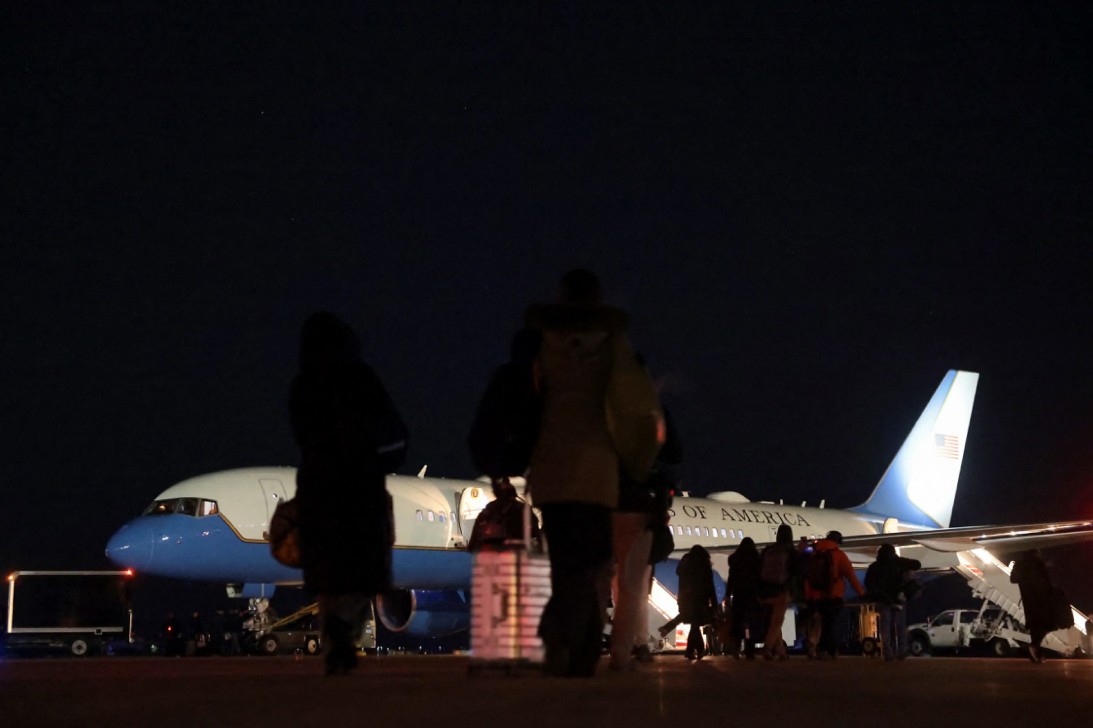 白宮表示特朗普將乘坐另一架飛機繼續前往達沃斯。圖為隨行記者轉機的情況。(路透社)