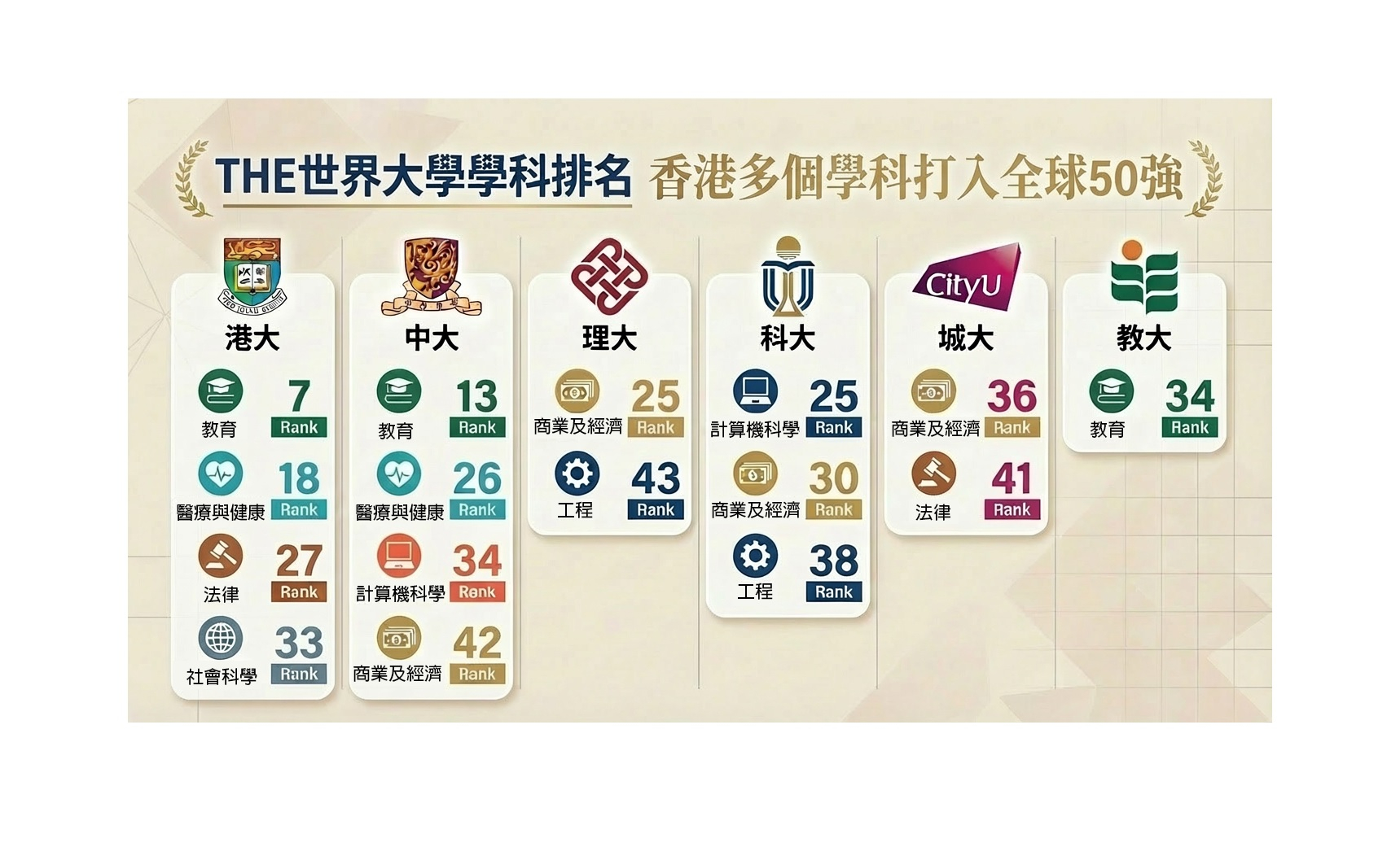 教育局局長蔡若蓮在社交專頁表示,香港高等院校在2026年泰晤士高等教育世界大學學科排名中展現卓越實力,教資會資助大學在11個主要學科領域均有優異表現,多個學科國際排名持續進步,不僅為香港發展八大中心提供有力人才支撐,亦進一步鞏固本港作為國際教育樞紐的地位。這些成果除展現本地高等教育界擁有良好的教育基建,也顯示政府全力透過教資會支持院校不斷革新優化,發揮一流大學的教研優勢,並配合院校擴容提質的成效。