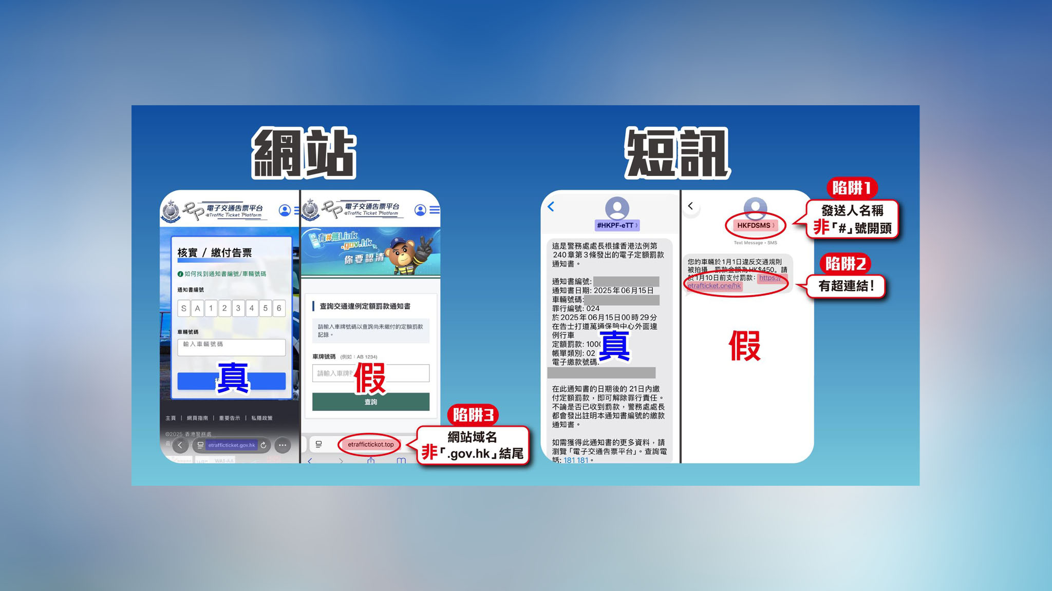 警方表示,有關的偽冒電子告票短訊所列的網站(https://etraffictickot.top/hk/, https://etrafticket.one/hk)並非官方平台,市民切勿點擊超連結。