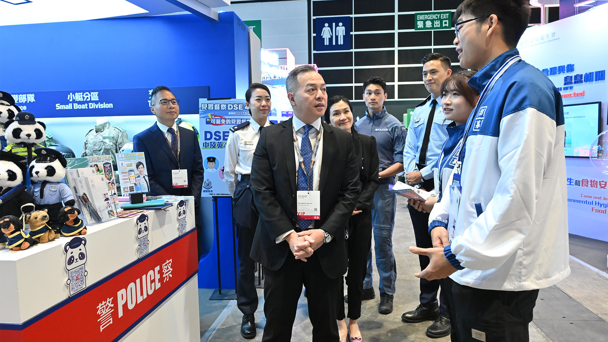 警務處處長周一鳴(前排左)參觀警隊攤位。(政府新聞處)