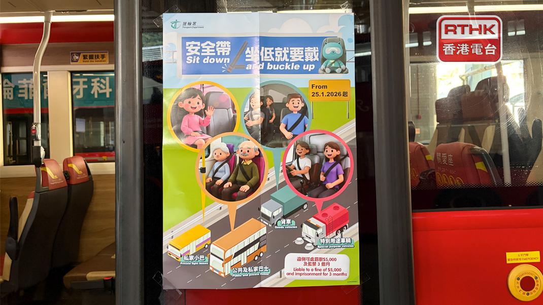 署方又說,為協助乘客適應,已跟專營巴士及港鐵巴士營辦商進一步加強宣傳和公眾教育,包括在港九新界人流較多的巴士總站,例如中環港澳碼頭、牛頭角樂華、葵涌大隴街、粉嶺皇后山及東涌站等巴士總站,以及不同公共運輸交匯處如屯門站、兆康站(北)和天水圍站等公共運輸交匯處,加派職員提醒乘客包括兒童、長者及有需要人士,穩妥佩戴安全帶,並於有需要時提供協助。