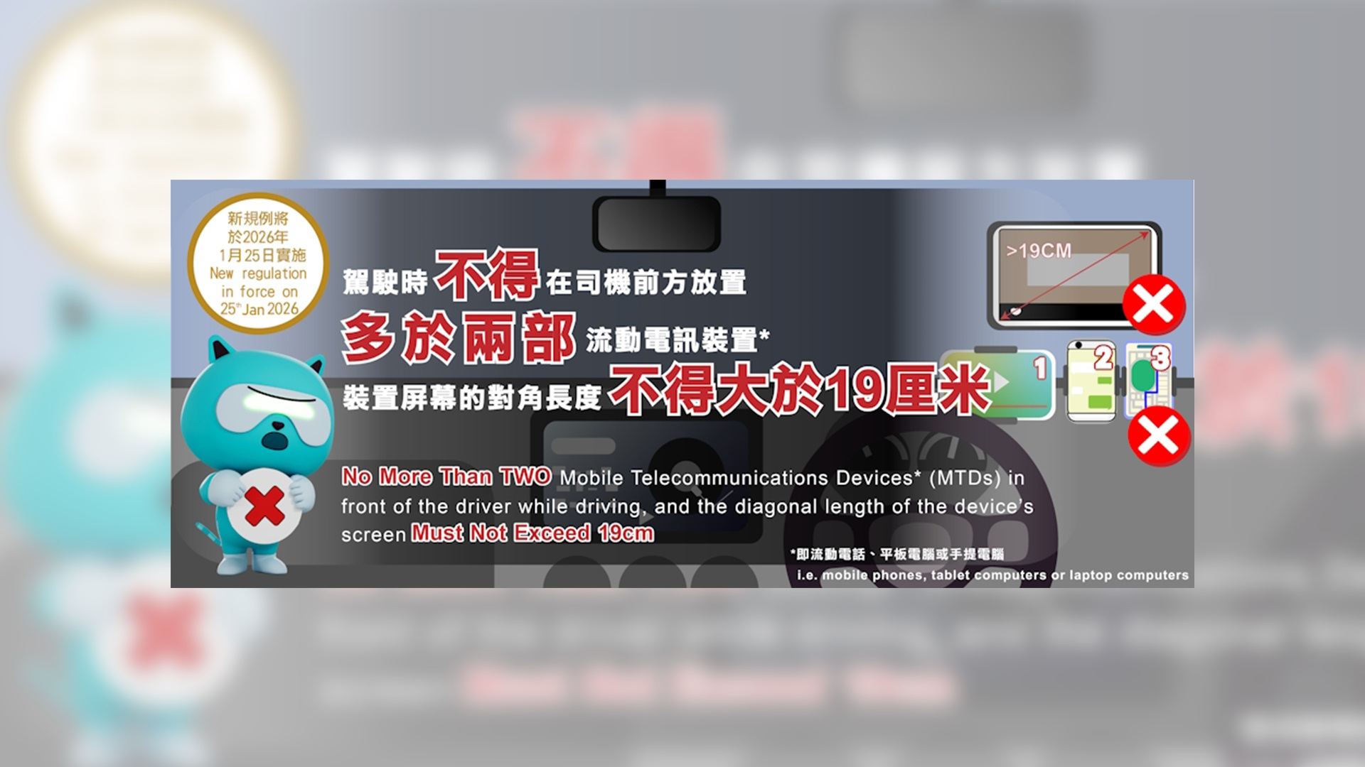 即日起司機駕駛時,不可以在前方放置多於兩部流動電訊裝置,包括流動電話、平板或手提電腦,每部裝置屏幕對角長度不可超過19厘米,違例者最高可被罰款2000元。