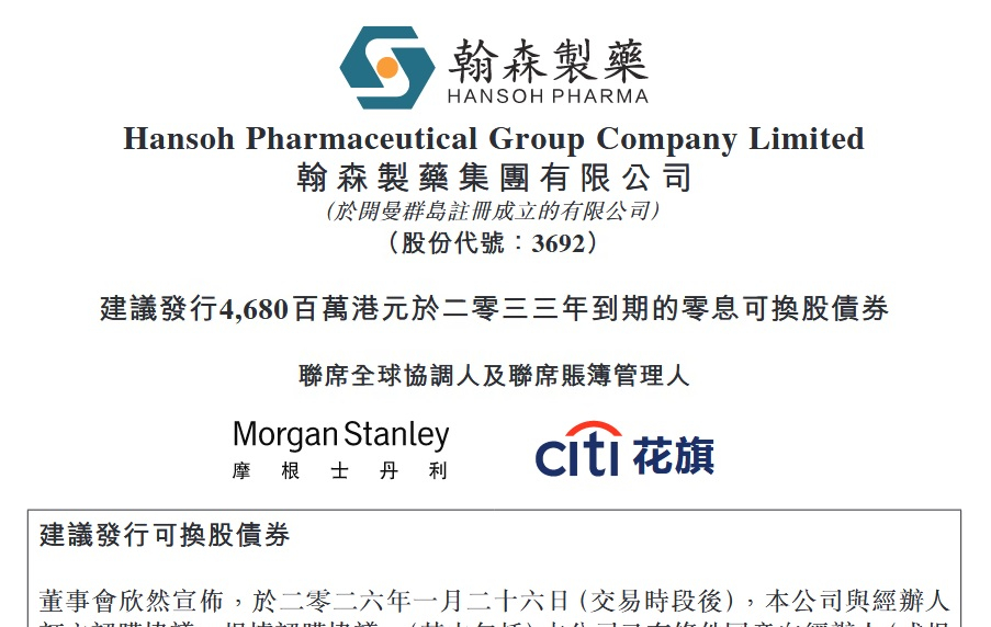 翰森製藥建議,發行46.8億港元於2033年到期的零息可換股債券。
