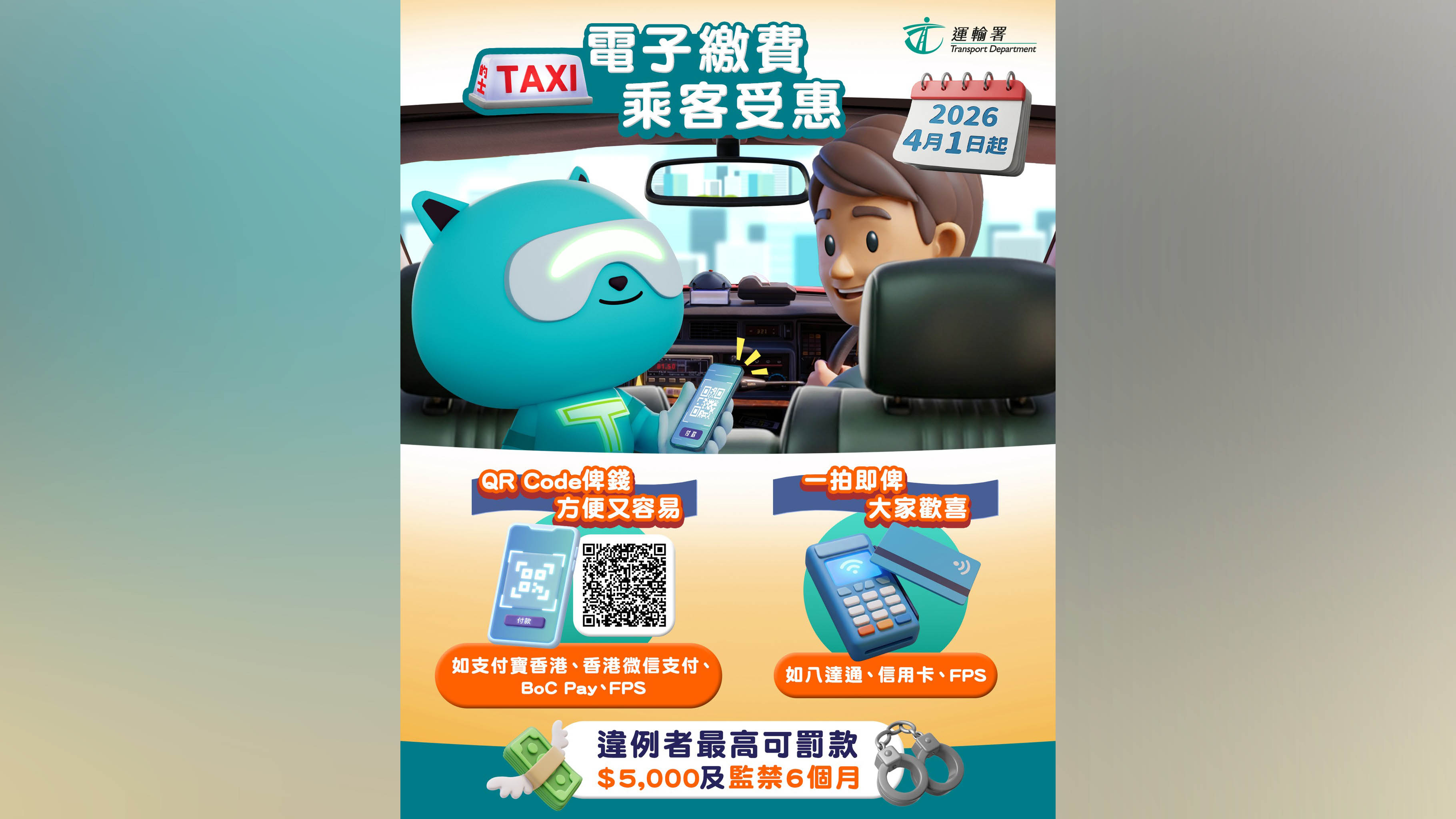 運輸署在社交專頁發帖文提醒,根據法例規定,由4月1日起,所有的士司機必須提供至少一種二維碼和一種非二維碼電子支付方式,供乘客支付車費。乘客將毋須擔心現金不足,亦可留有支付紀錄;而司機可以節省找續時間及減少遺失現金的風險。