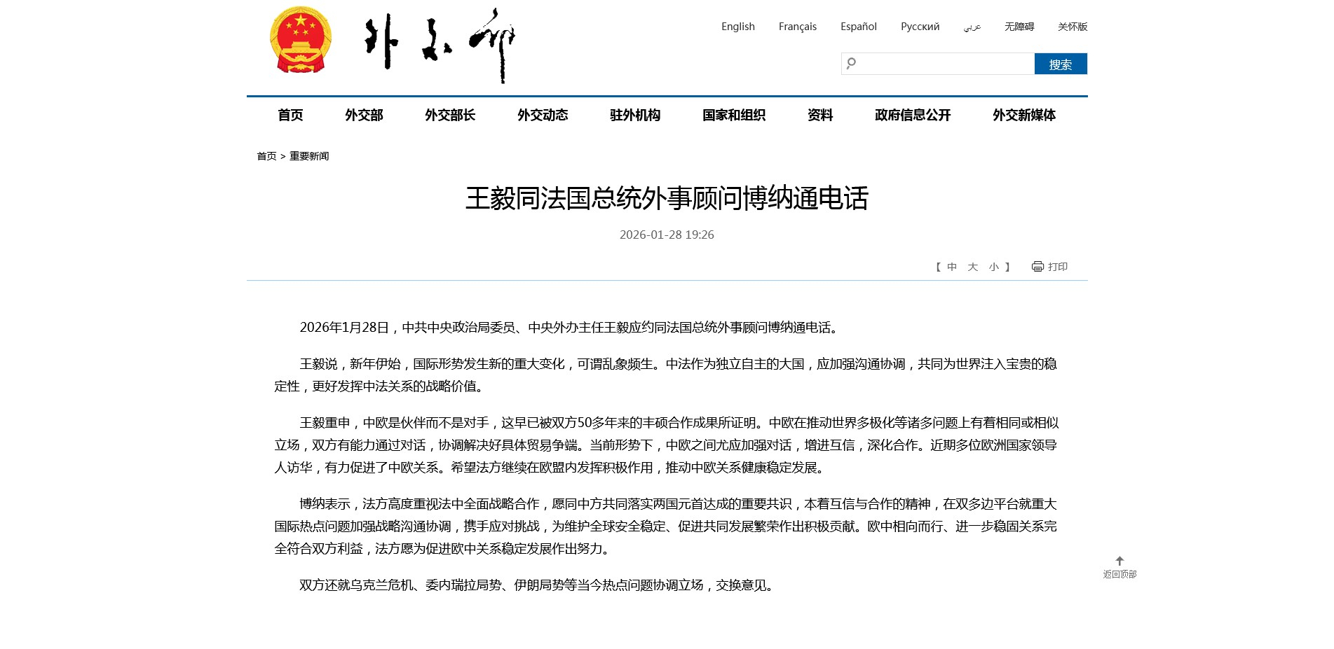 中共中央政治局委員、中央外辦主任王毅,應約同法國總統外事顧問博納通電話。