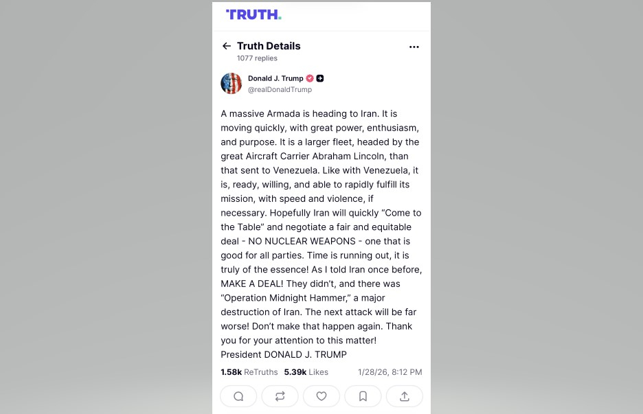 美國總統特朗普在旗下社交平台上說,一支龐大的艦隊正前往伊朗,已準備好迅速履行使命。他表示,希望伊朗能夠迅速坐到談判桌前。