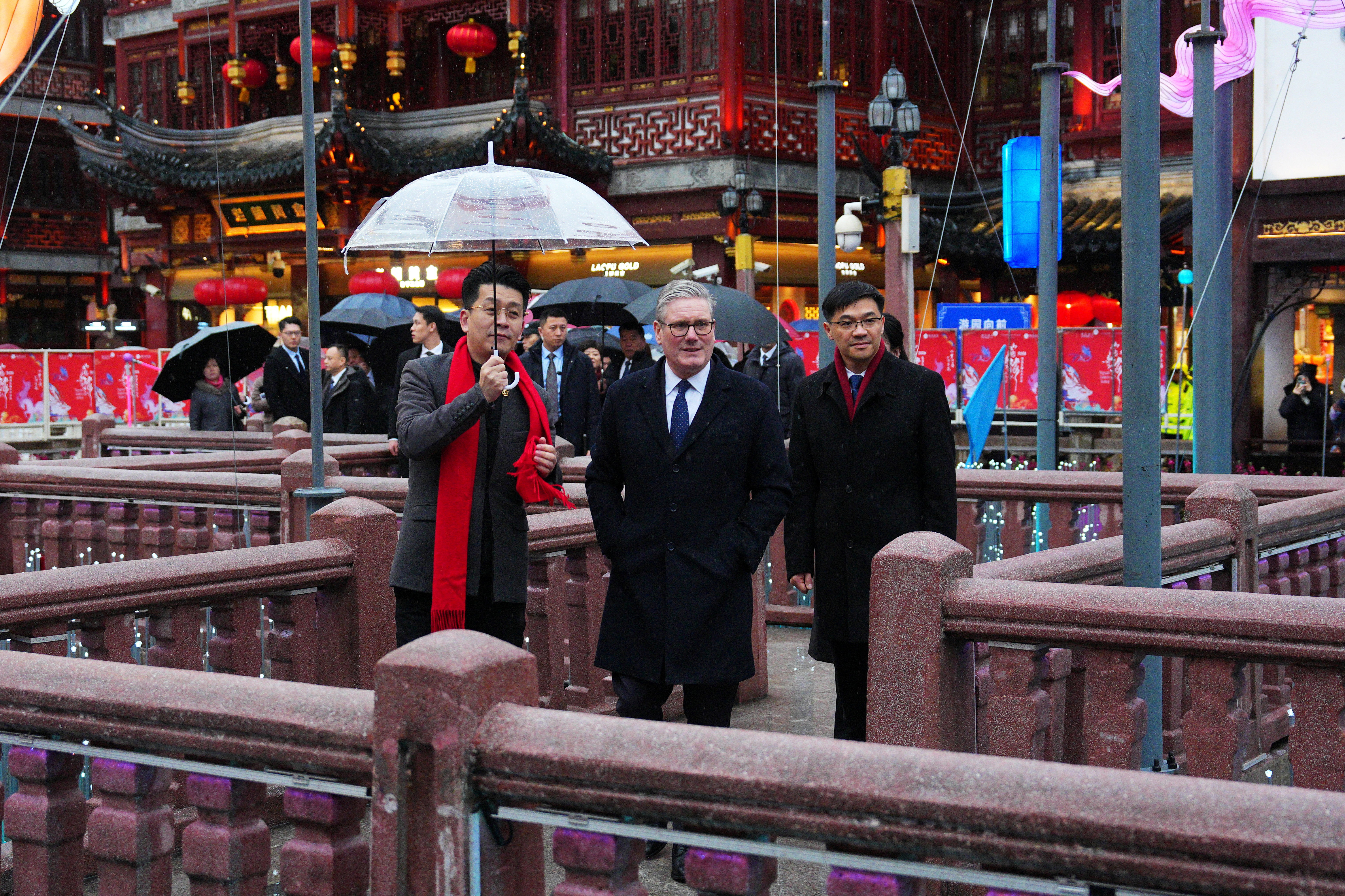 英國首相施紀賢下午抵達訪華的第二站上海。他到訪上海地標豫園,在隨行人員陪同,走過豫園的九曲橋。