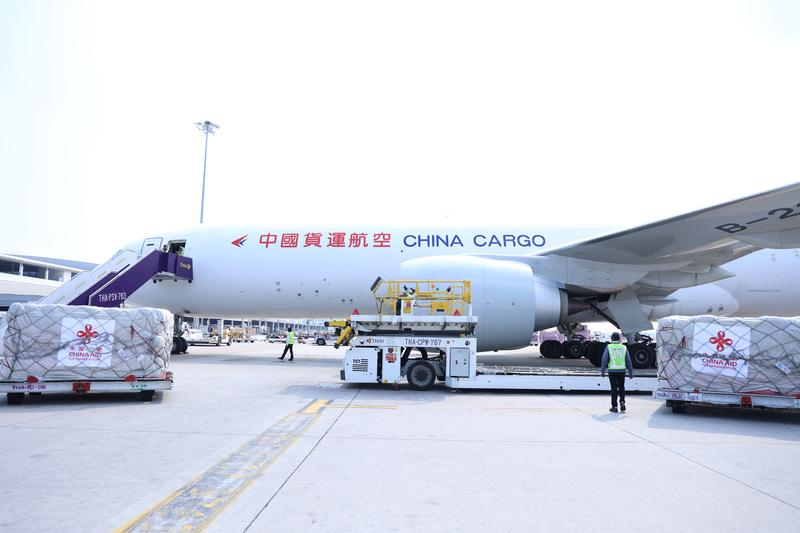 中國政府首批援泰人道主義物資運抵泰國首都曼谷的素萬那普機場,中國駐泰國大使張建衛及泰國國防部長納塔蓬等出席交接儀式。