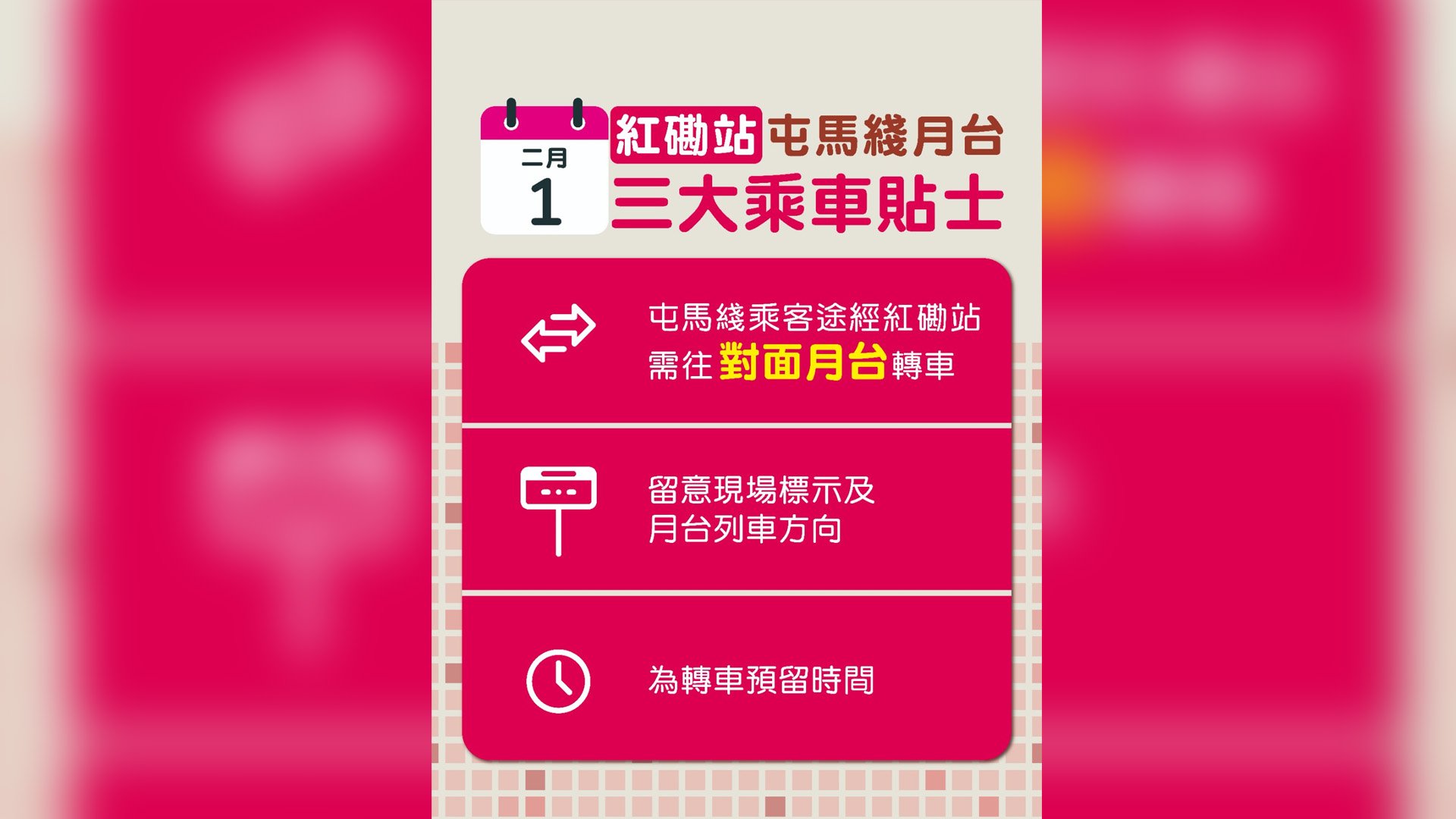 港鐵公司提醒屯馬綫乘客,若車程途經紅磡站,便需在該站下車往對面月台轉車繼續行程,為轉車預留時間,亦要留意現場標示及月台列車方向。