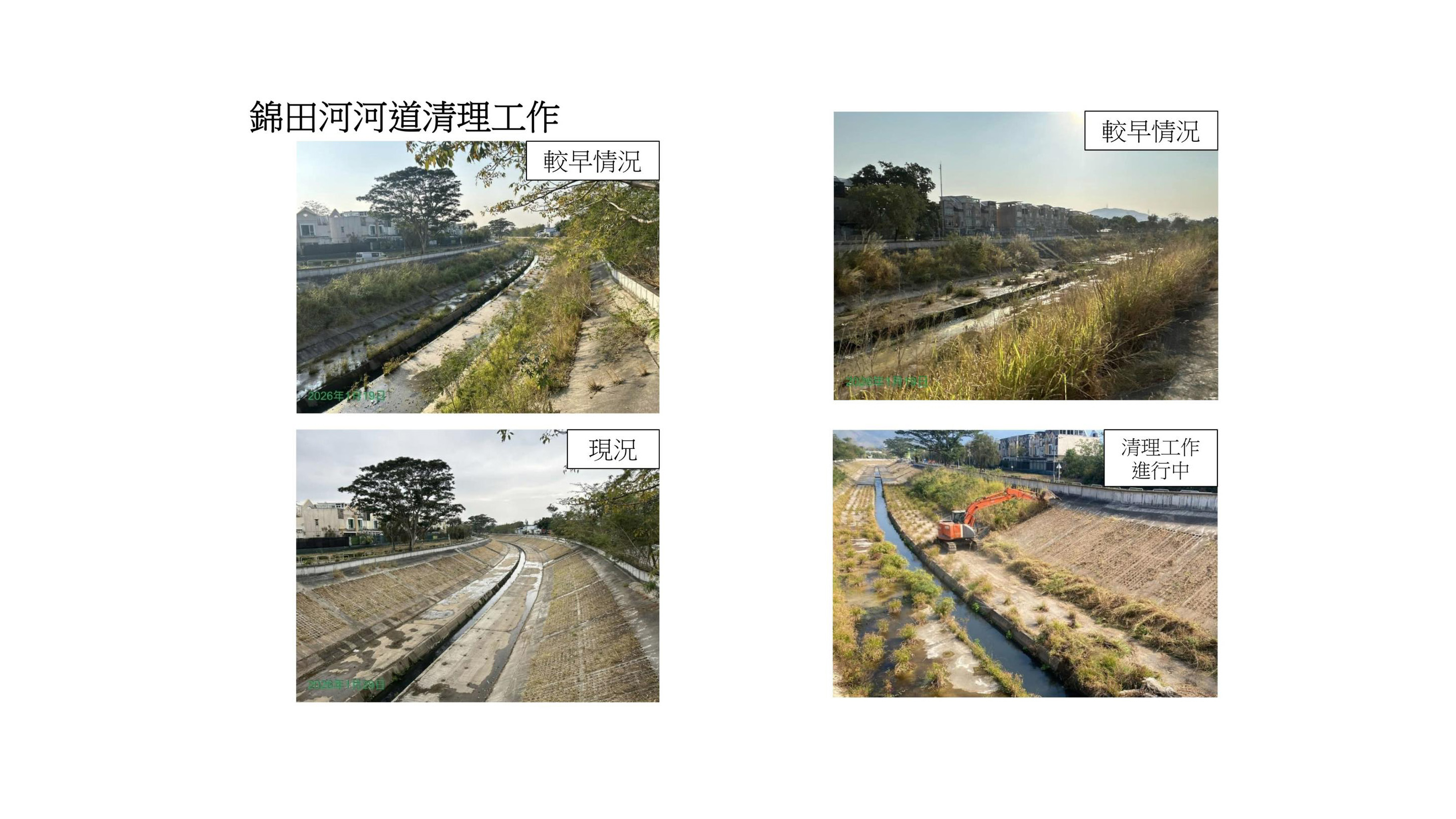 針對錦田河,渠務署在社交網站說,已於去年11月展開河道清理工作,目前進度理想,整體已清理約4000噸淤泥、雜草及垃圾,估計尚餘1000噸需要清理,會於今年3月完成,署方早前收到元朗區議會反映錦田河上游個別位置有雜草及垃圾堆積情況,已優先處理有關個案,會盡快完成。