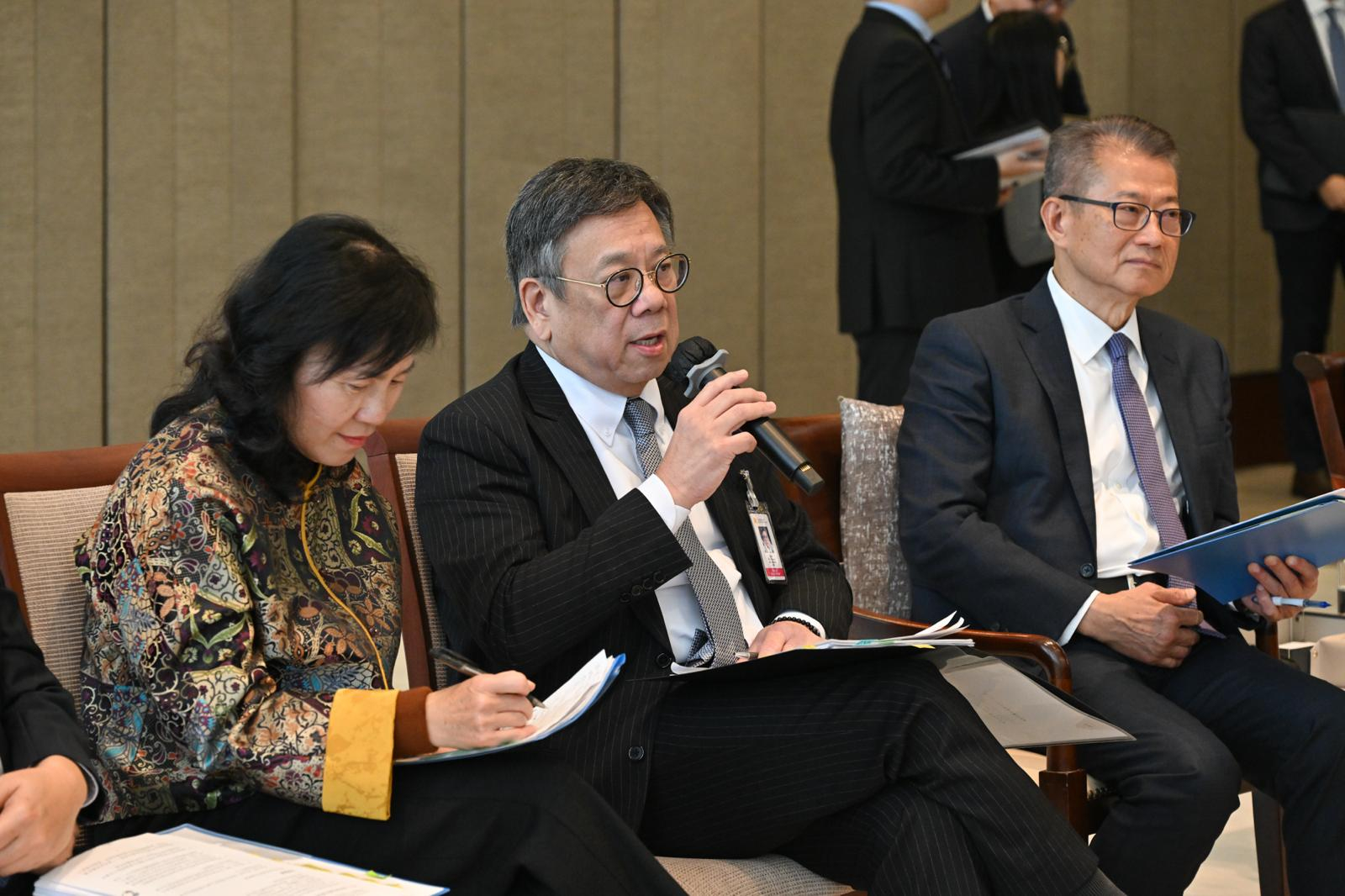 財政司司長陳茂波率領幾名政策局局長出席新一屆立法會首次前廳交流會。商務及經濟發展局局長丘應樺表示,感謝議員提出很多寶貴及具前瞻性意見,透過務實的互動交流,對政府推行和制定政策措施,尤其在國家「十五五」規劃下,持續發揮香港的國家優勢和國際優勢尤其重要。